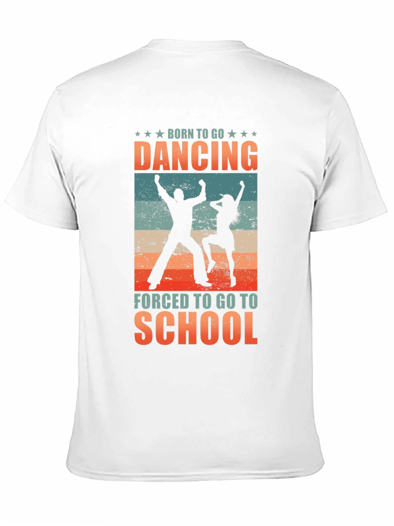 This black graphic tee is perfect for dance lovers with a sense of humor. It features a retro-style design with silhouettes of a dancing man and woman. The shirt is emblazoned with the words "Born to Go DANCING" above the silhouettes and "FORCED TO GO TO SCHOOL" below. The graphic is set against a striped background in teal, cream, and orange. It's a comfortable, casual piece that is ideal for dance class, school, or everyday wear. Show off your passion for dance!