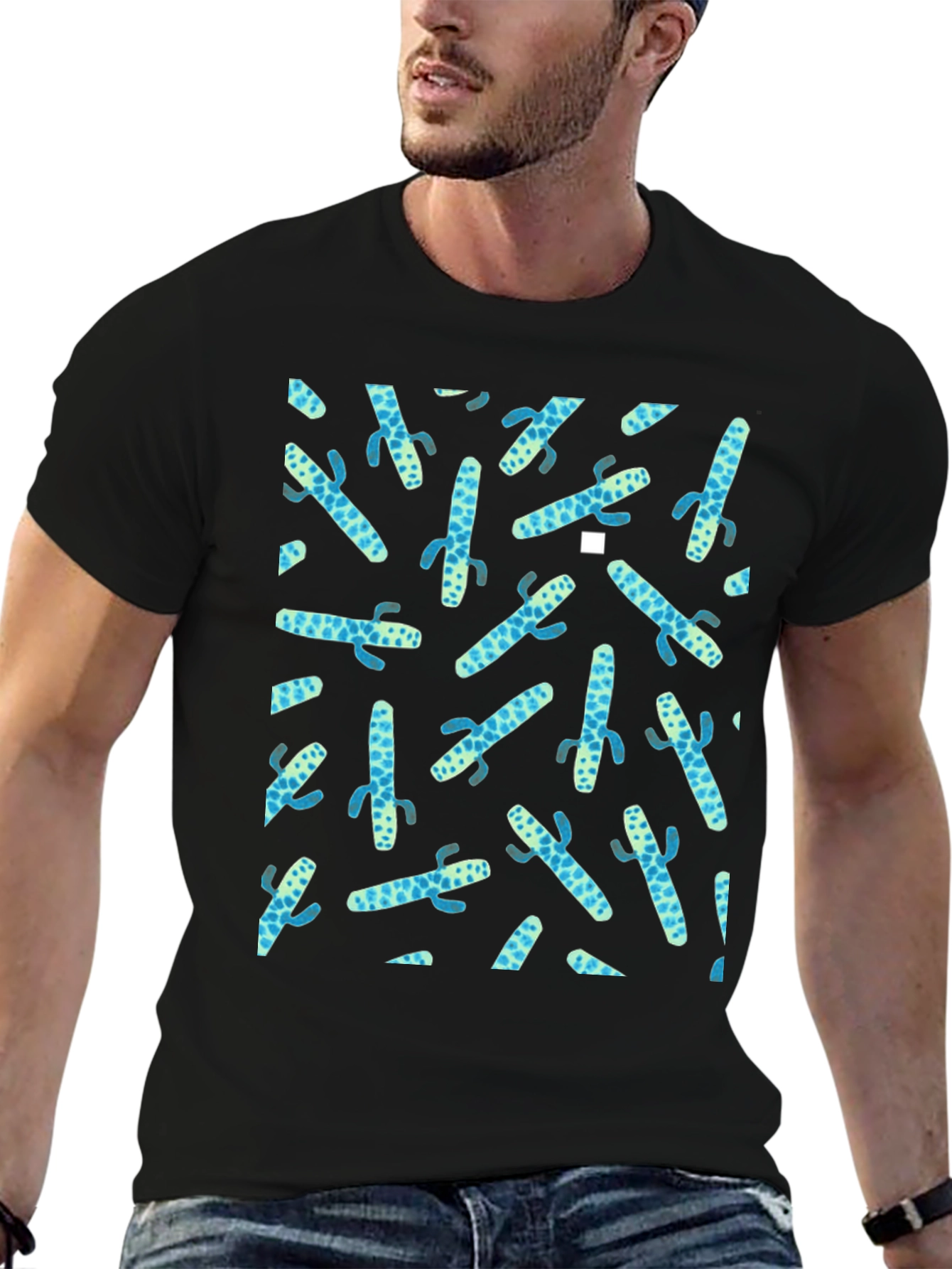 Elevate your casual wear with this stylish black T-shirt featuring a playful cactus print. The tee showcases an all-over pattern of stylized blue and light blue cacti, adding a touch of whimsy to your everyday look. Made from a comfortable, breathable fabric, this crew neck shirt offers a relaxed fit perfect for warm weather or layering. Pair it with jeans, shorts, or chinos for a fun and fashionable outfit. Ideal for casual outings, weekend adventures, or simply lounging in style. Express your unique personality with this eye-catching cactus print tee!