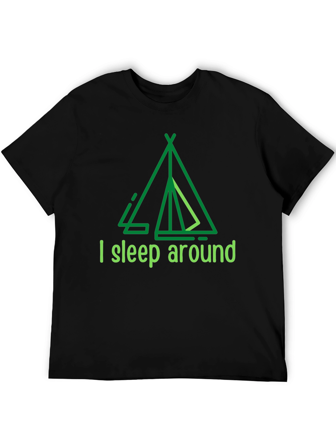 Show off your love for the outdoors with this playful black t-shirt! Featuring a stylized green tent graphic and the humorous phrase 'I sleep around,' this tee is perfect for campers, hikers, and anyone who enjoys a good laugh. Made from a comfortable fabric, it's ideal for casual wear, camping trips, or as a conversation starter. Get yours today and let everyone know about your adventurous side! The design is eye-catching and fun, making this t-shirt a great gift for the outdoor enthusiast in your life.