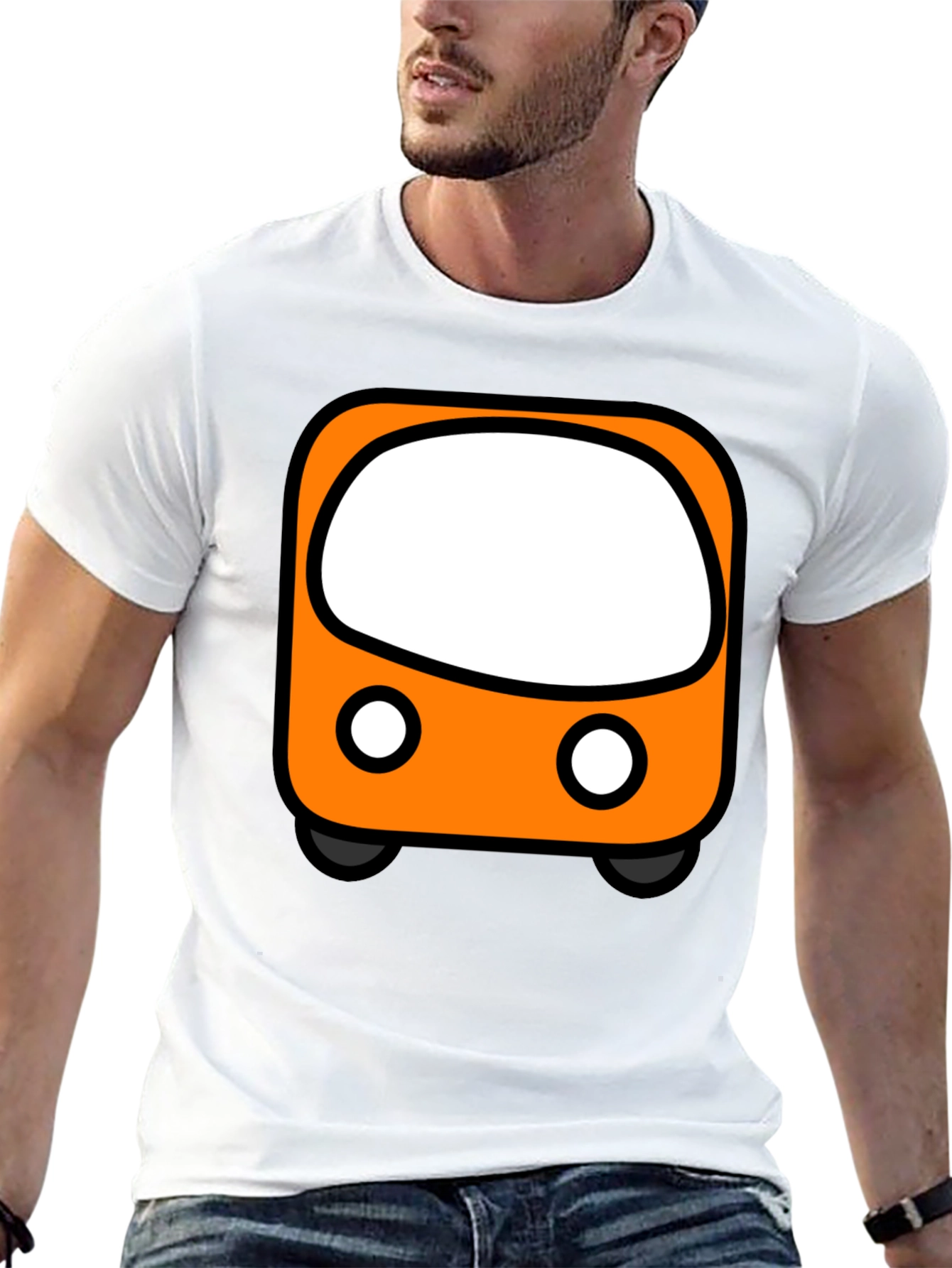 This stylish black t-shirt features a fun, cartoon-style graphic of a bright orange bus. The bus design has a white windshield and playfully rounded features. Made from a soft-looking fabric, this tee appears comfortable and durable. Its classic fit makes it suitable for everyday wear. Ideal for casual outings, school, or lounging at home, this tee adds a touch of whimsy to any outfit. Perfect for those who love unique and eye-catching designs, grab this playful bus graphic tee today and showcase your fun side!