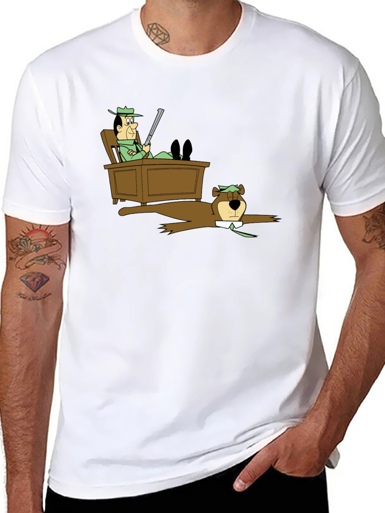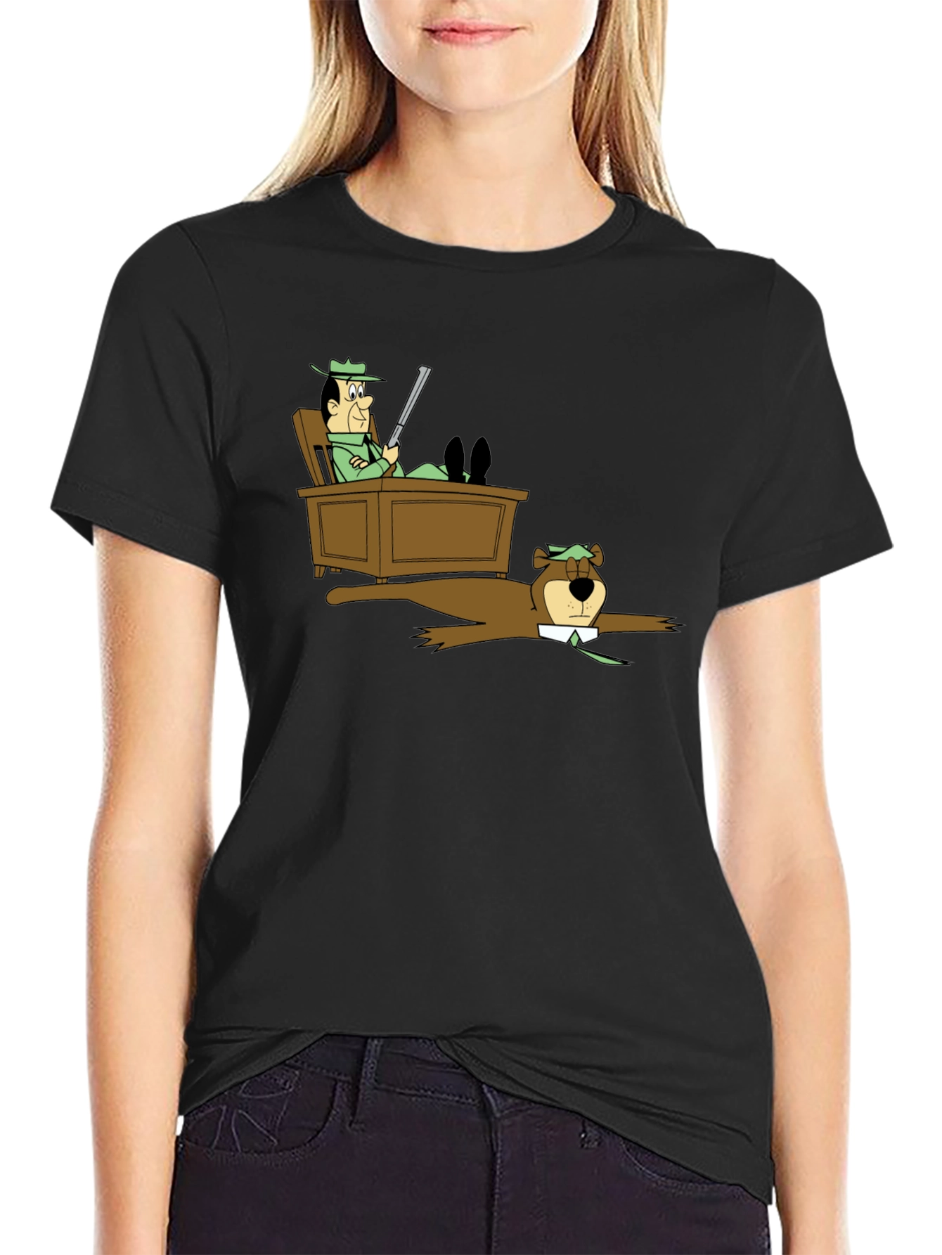 This black t-shirt features a fun and nostalgic cartoon graphic. The design depicts a cartoon man in a green suit at a desk with a rifle, with a bear sprawled out in front of the desk. Made from a soft, comfortable-looking fabric, this tee is perfect for casual wear. The vibrant graphic adds a playful touch to a classic wardrobe staple, making it ideal for everyday outfits or as a fun statement piece. Showcase your love for classic animation with this unique tee.