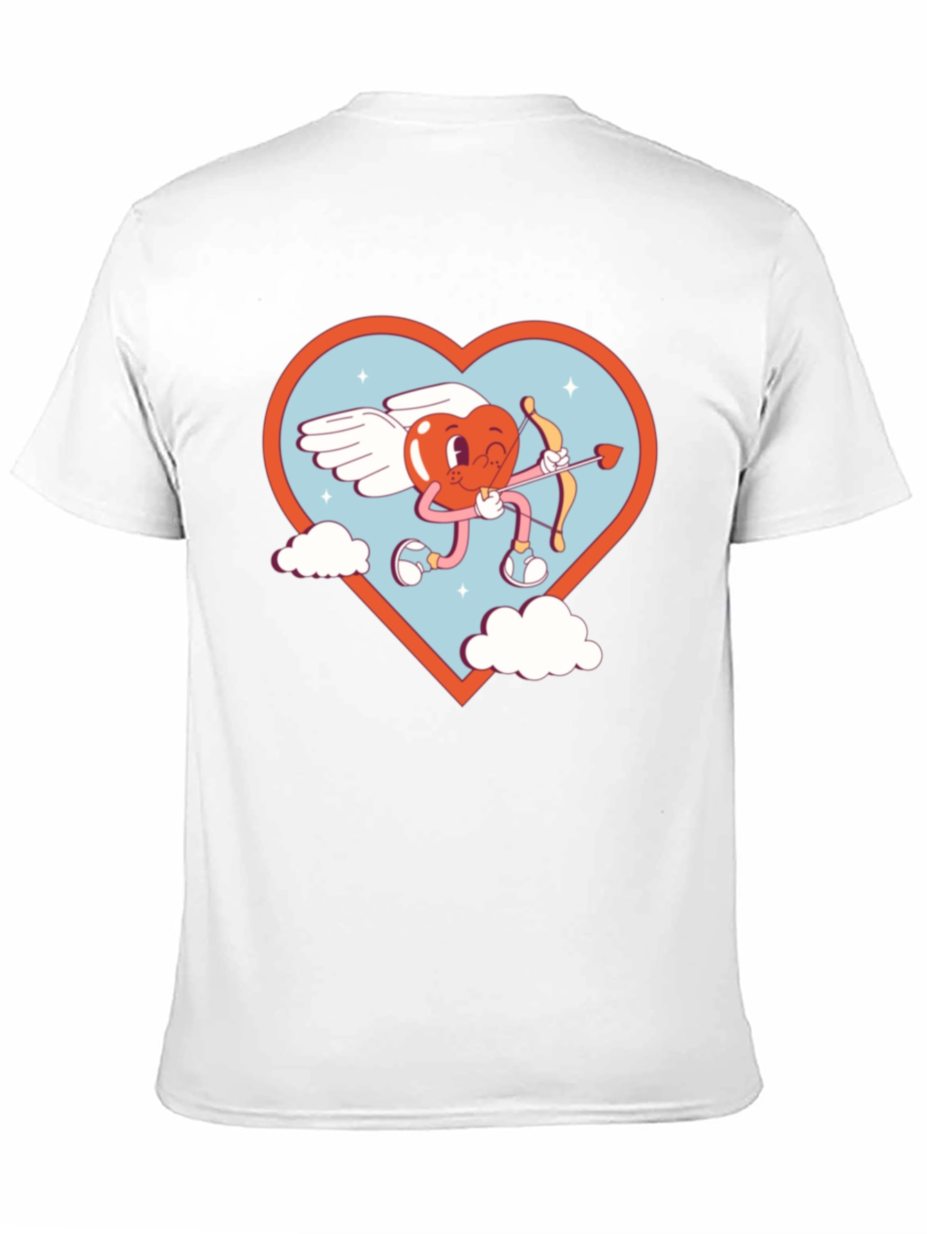Show your love with this unique black t-shirt featuring a cartoon heart cupid design! The whimsical graphic shows a cheerful heart with wings, holding a bow and arrow, set against a heart-shaped backdrop with clouds and stars. Perfect for Valentine's Day or any day you want to spread the love. Made from a soft, comfortable fabric, this shirt is ideal for casual wear, adding a touch of fun to your everyday style. Grab yours today and let your heart fly!