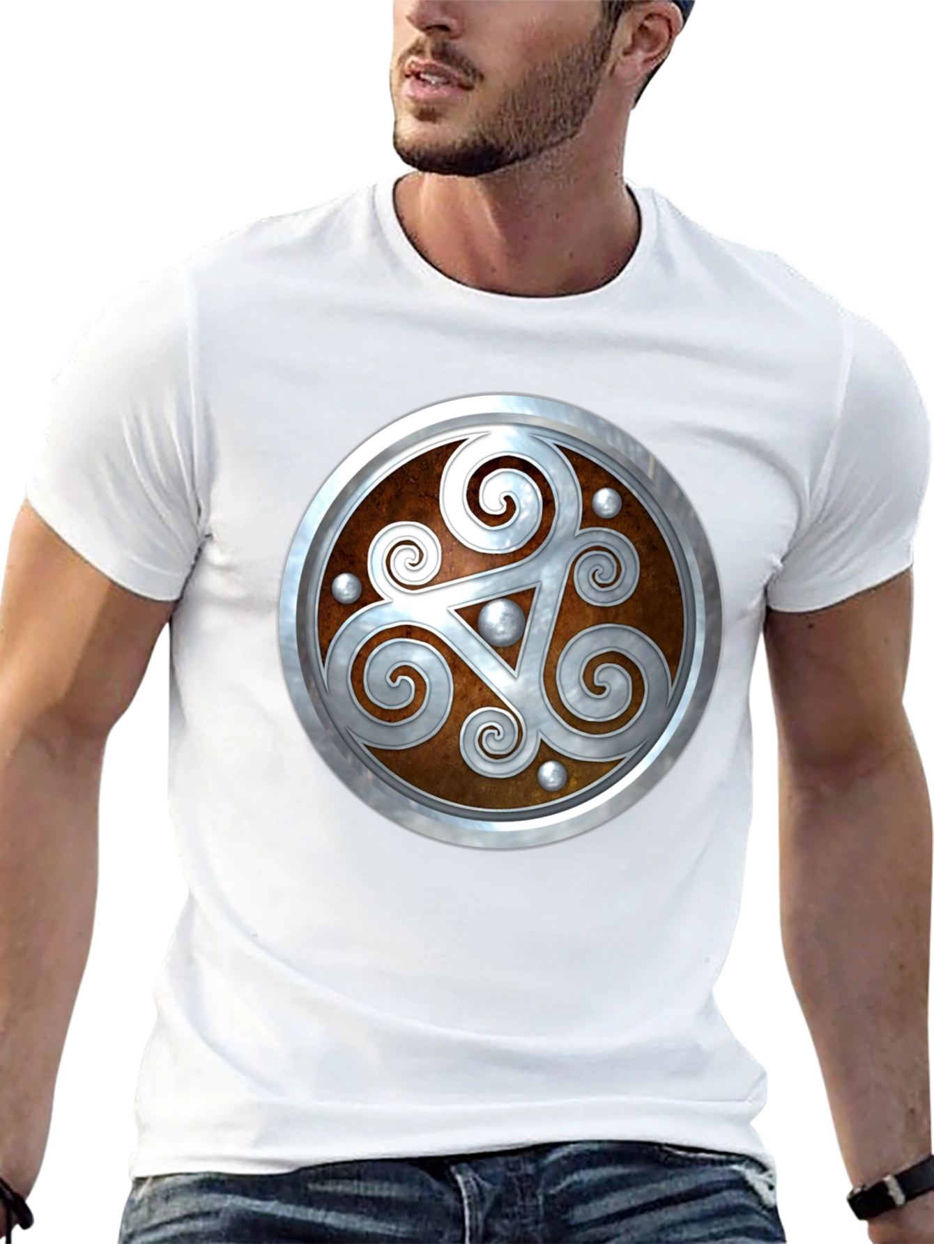 Showcase your Celtic pride with this striking black t-shirt. The shirt features a detailed graphic of a Celtic shield emblazoned on the front. The design includes intricate spiral patterns and what appear to be metal accents, giving it a battle-ready aesthetic. Made from a comfortable cotton blend, this tee is perfect for everyday wear. The design is best suited for historical reenactments, cosplay events, or simply as a unique addition to your casual wardrobe. Pair it with jeans or shorts for a casual, yet stylish look.