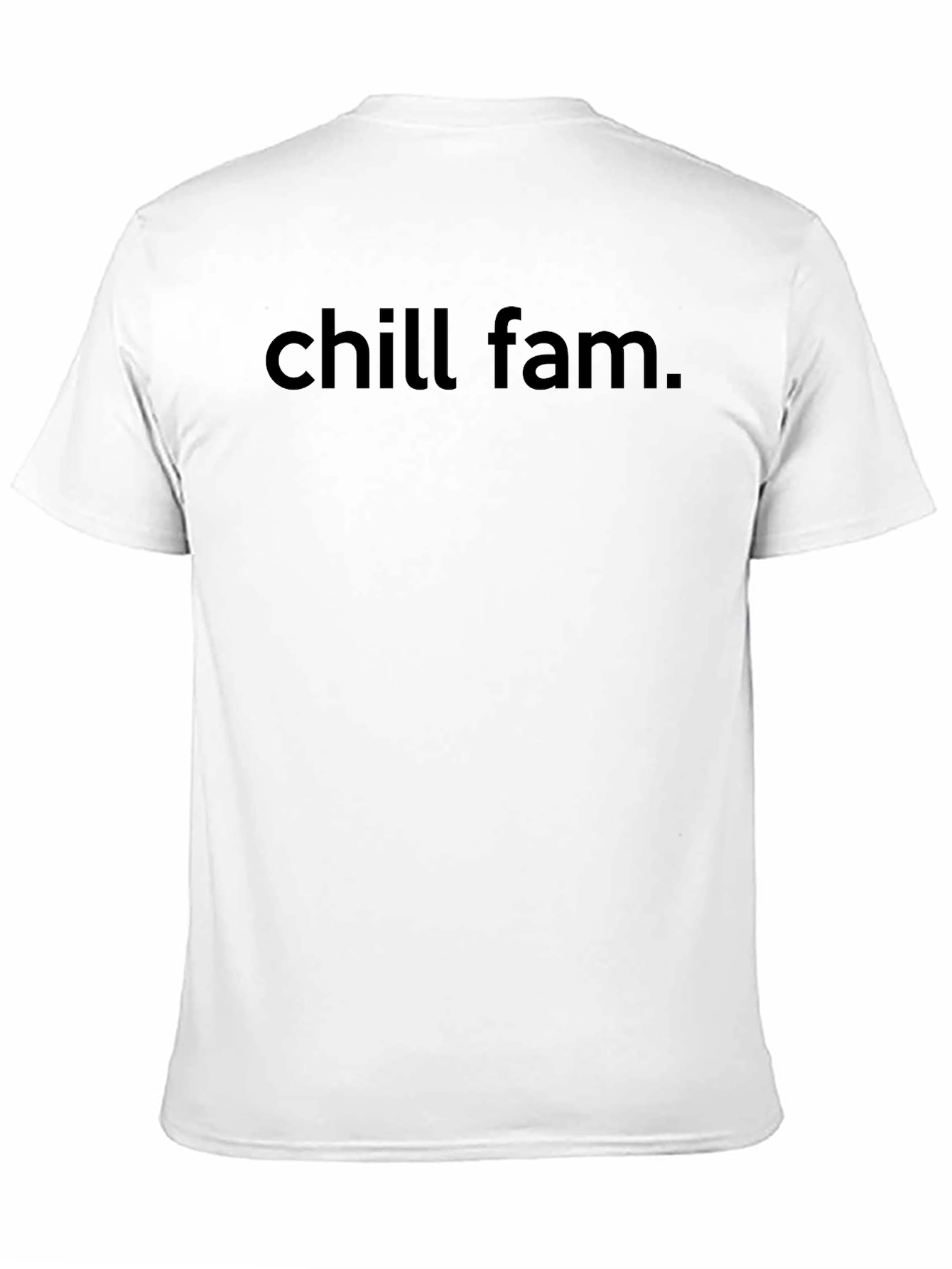 Embrace laid-back vibes with this classic black t-shirt. The simple yet impactful "chill fam." graphic adds a touch of relaxed humor to your everyday style. Made from comfortable, breathable fabric, this tee is perfect for lounging at home, hanging out with friends, or running errands in style. Its versatile design pairs effortlessly with jeans, shorts, or joggers for a casual, cool look. Show off your easygoing personality and stay comfortable all day long with this must-have addition to your wardrobe.
