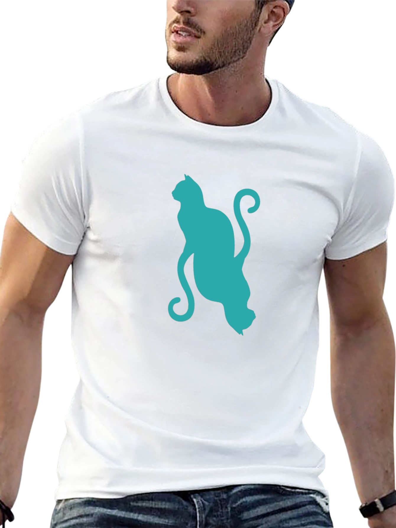 Show off your feline admiration with this stylish black t-shirt. It features a striking turquoise silhouette of a cat with a playfully curled tail. Made from a comfortable, breathable fabric, this tee is perfect for everyday wear. The bold graphic makes a statement while maintaining a minimalist aesthetic. This unique shirt is ideal for casual outings, lounging at home, or as a conversation starter among cat lovers. Wear your passion with pride!