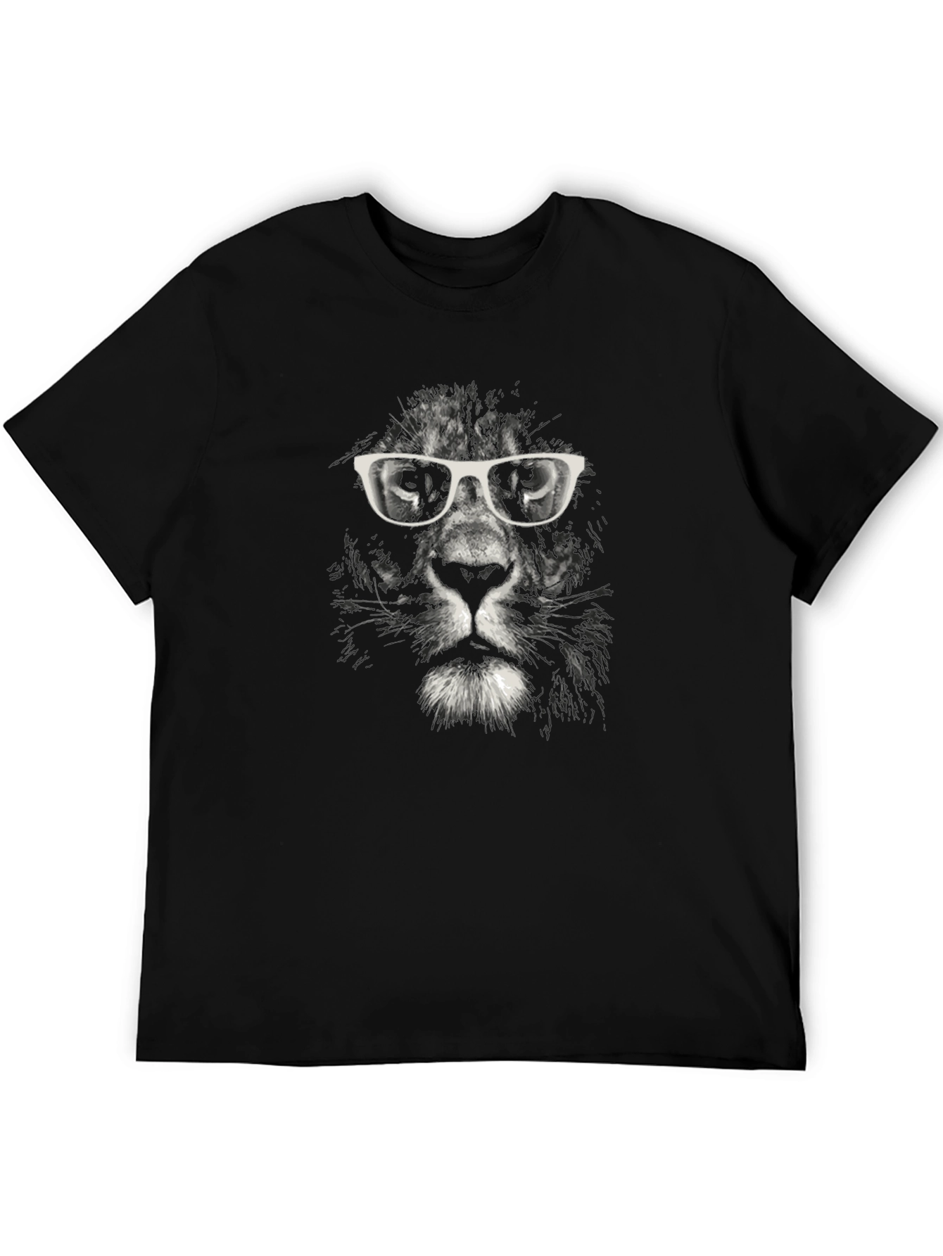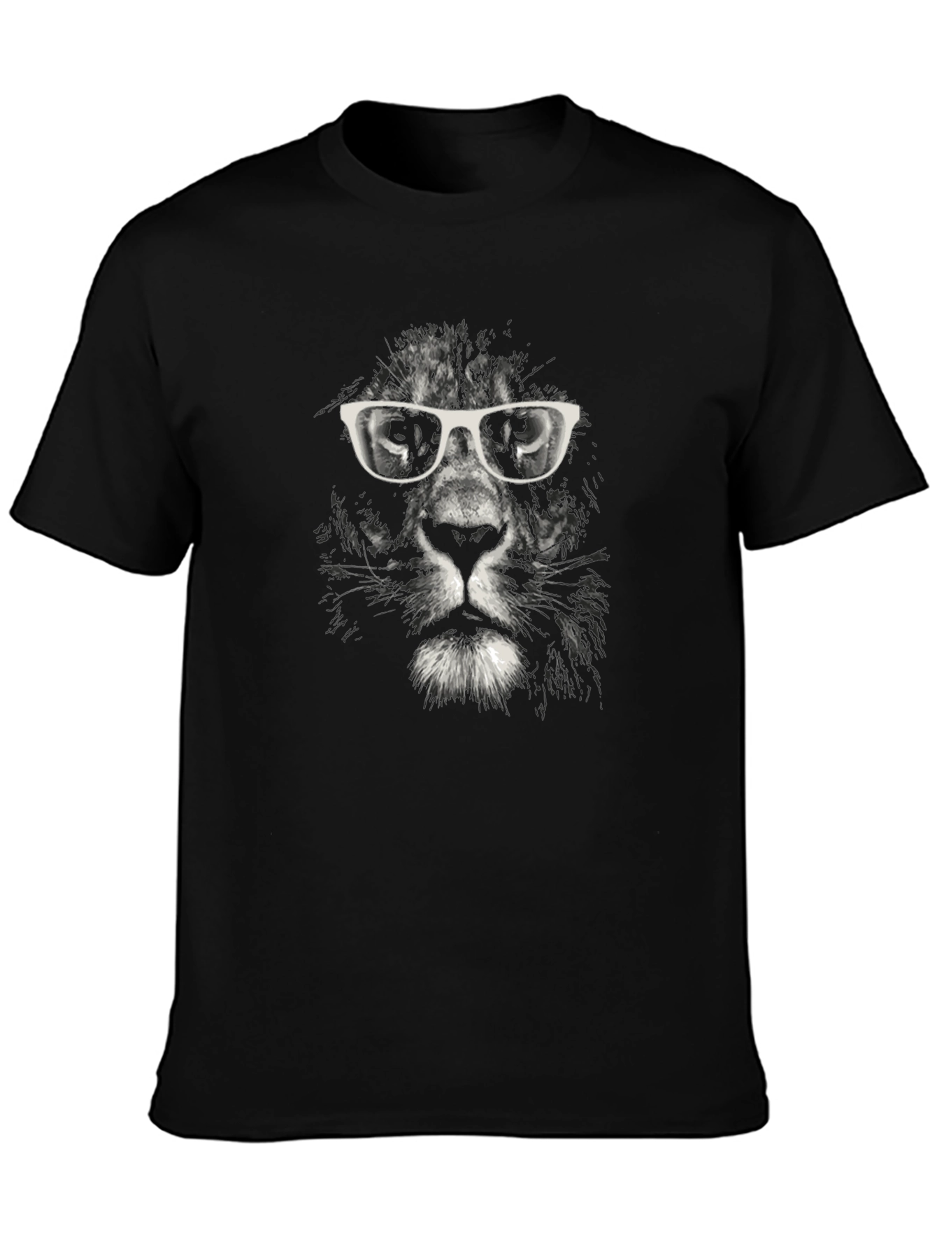 Show off your cool and quirky side with this unique black t-shirt. Featuring a striking graphic of a lion wearing stylish glasses, this tee is sure to turn heads. The design is printed on a comfortable, high-quality black fabric, perfect for everyday wear. Whether you're a fan of big cats, a lover of quirky designs, or simply want to make a statement, this t-shirt is the perfect addition to your wardrobe. Pair it with jeans or shorts for a casual look, or dress it up with a blazer for a more edgy ensemble. This graphic tee is not just clothing; it's a conversation starter.