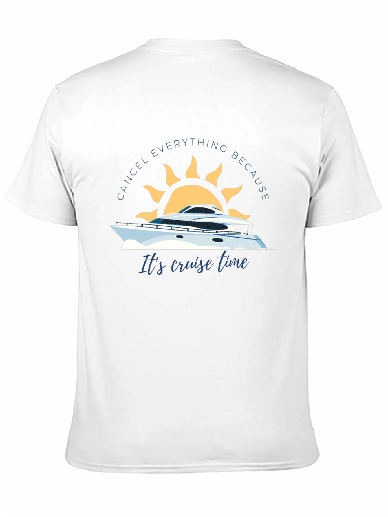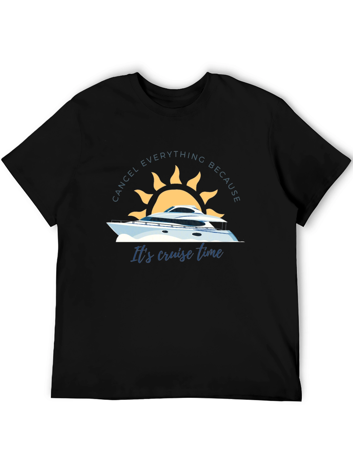 Get ready to set sail with this stylish black t-shirt featuring a vibrant cruise ship graphic. The design includes a sleek yacht silhouette overlaid with a sunny backdrop, and the text "Cancel Everything Because It's cruise time" in a stylish, eye-catching font. Made from what appears to be a soft and comfortable fabric, this tee is perfect for your next vacation or casual day out. Show off your love for the ocean and adventure with this unique and trendy top. Ideal for cruise enthusiasts and travelers.