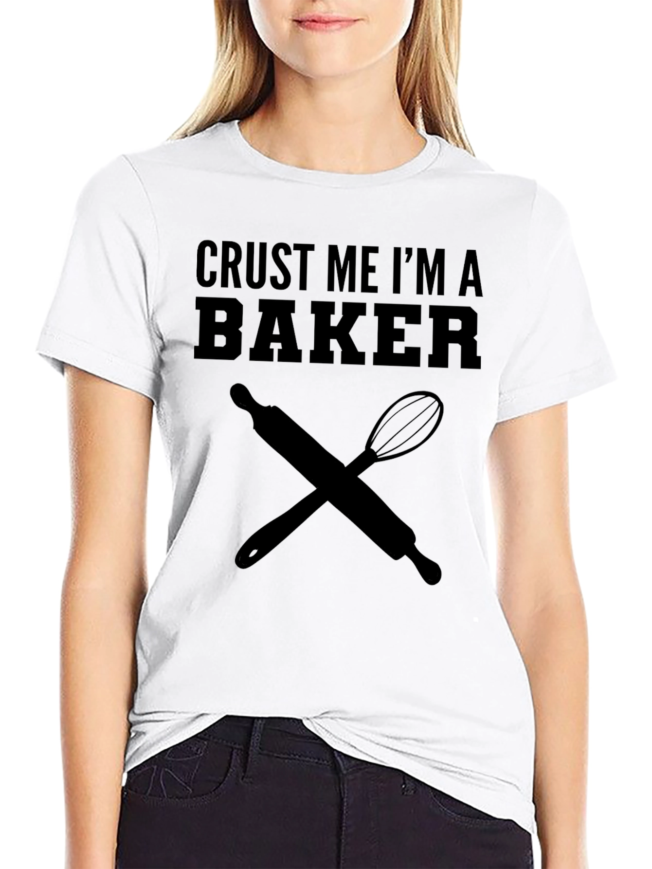 Show off your baking skills with this fun 'Crust Me I'm A Baker' t-shirt! This black tee features a playful graphic with crossed rolling pin and whisk, perfect for any baking enthusiast. Made from a soft, comfortable fabric, this shirt is ideal for casual wear, baking sessions in the kitchen, or as a gift for your favorite baker. Express your love for baking in style. Get yours today and let everyone know you're serious about baking!