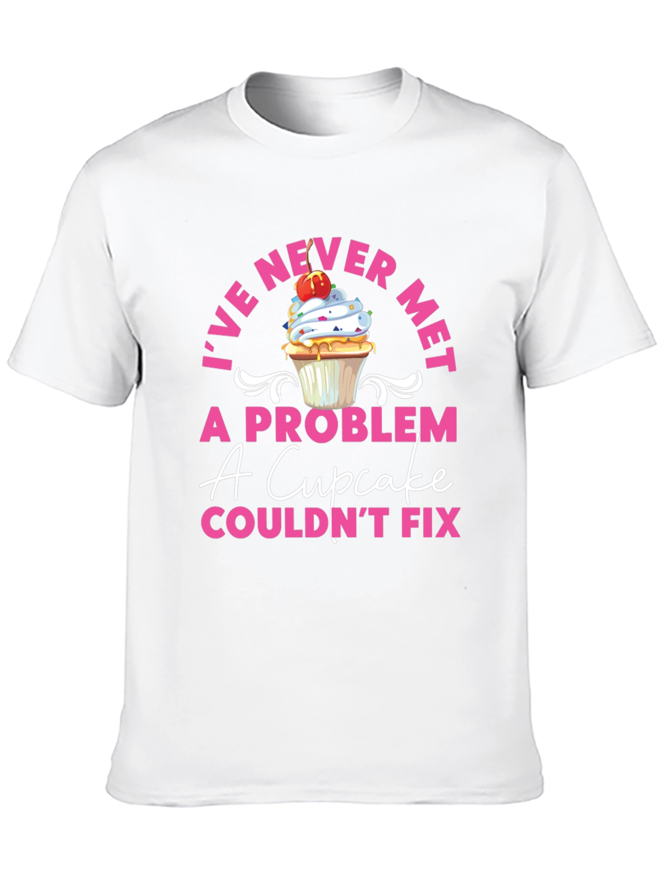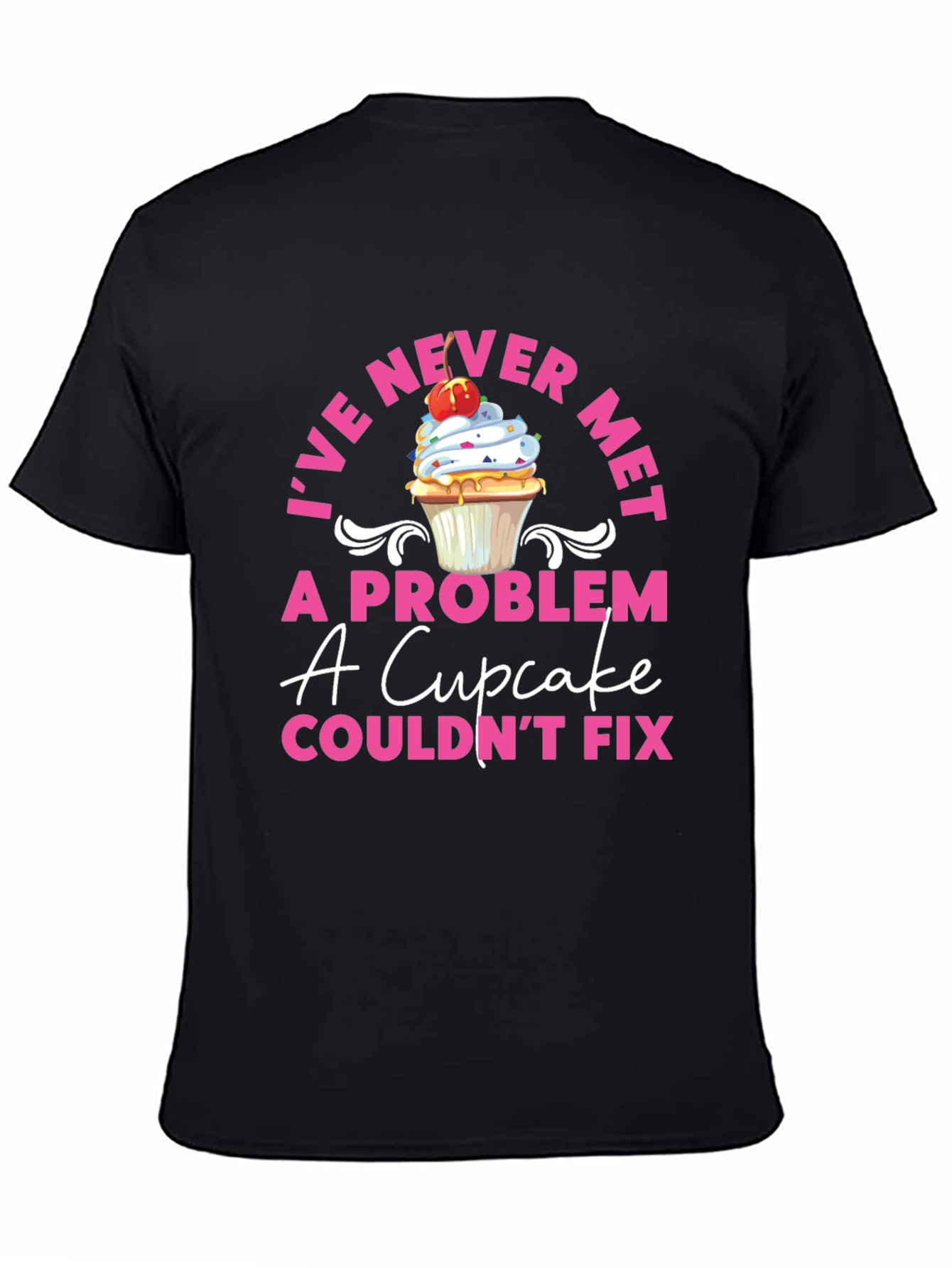 This black t-shirt features a playful design with the phrase "I've Never Met a Problem a Cupcake Couldn't Fix." The design includes an illustration of a cupcake topped with a cherry. Made from soft, breathable fabric, this tee offers both comfort and style. It's perfect for casual wear, baking enthusiasts, or anyone who appreciates a touch of humor in their wardrobe. Show off your love for cupcakes and your optimistic attitude with this unique and eye-catching t-shirt.