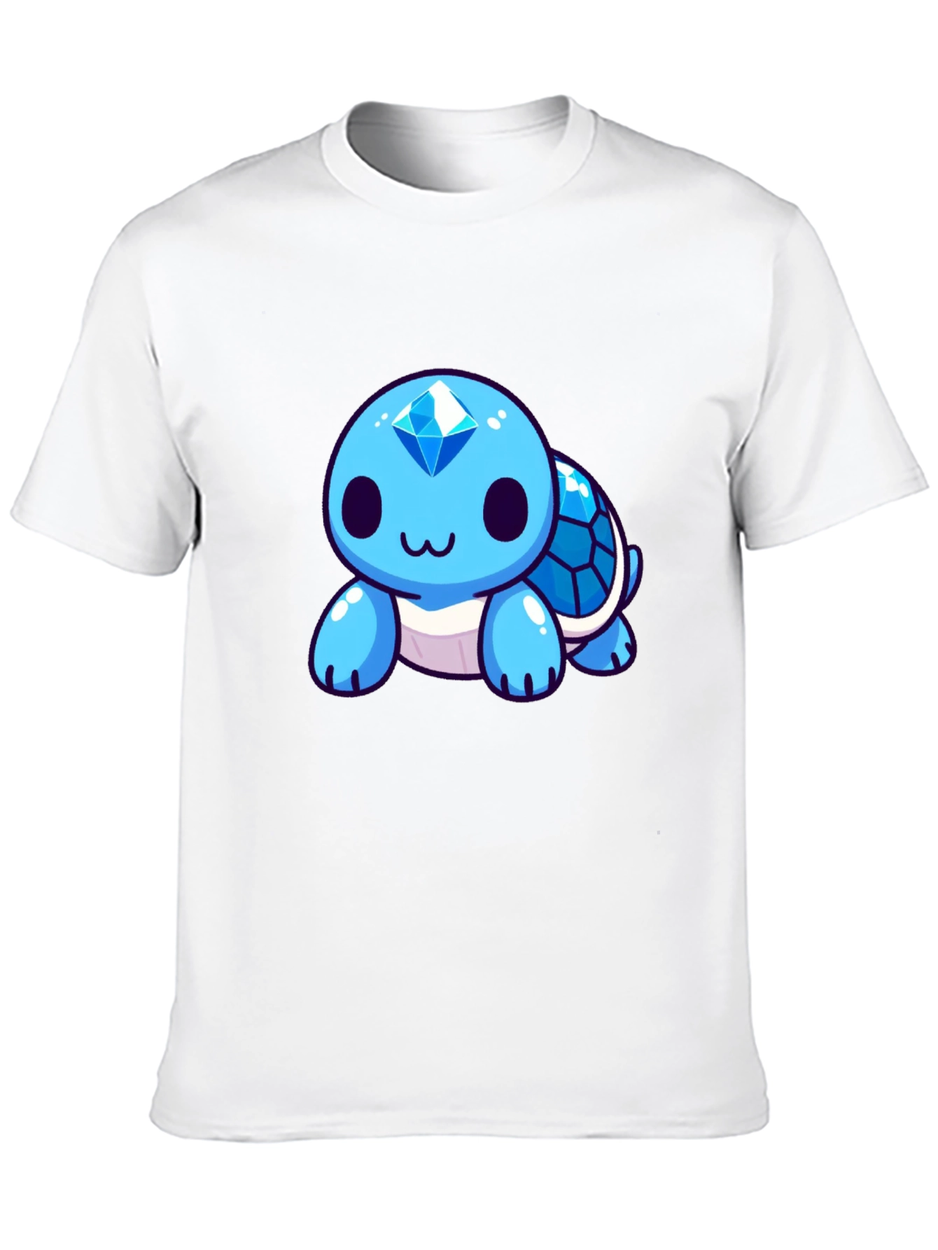 This black t-shirt features an adorable light blue turtle graphic. The cartoon turtle has a large diamond on its head and a sweet, smiling face. The tee is made of a soft-looking material perfect for casual wear. This unique shirt adds a pop of color and fun to any outfit, making it ideal for everyday wear or a fun, playful event. The vibrant graphic stands out against the shirt's dark background. It's a great conversation starter and a charming addition to your wardrobe.