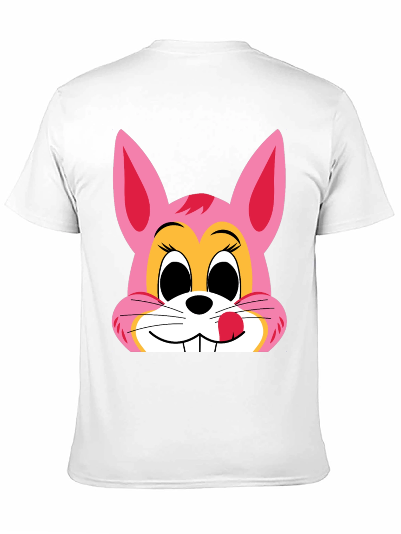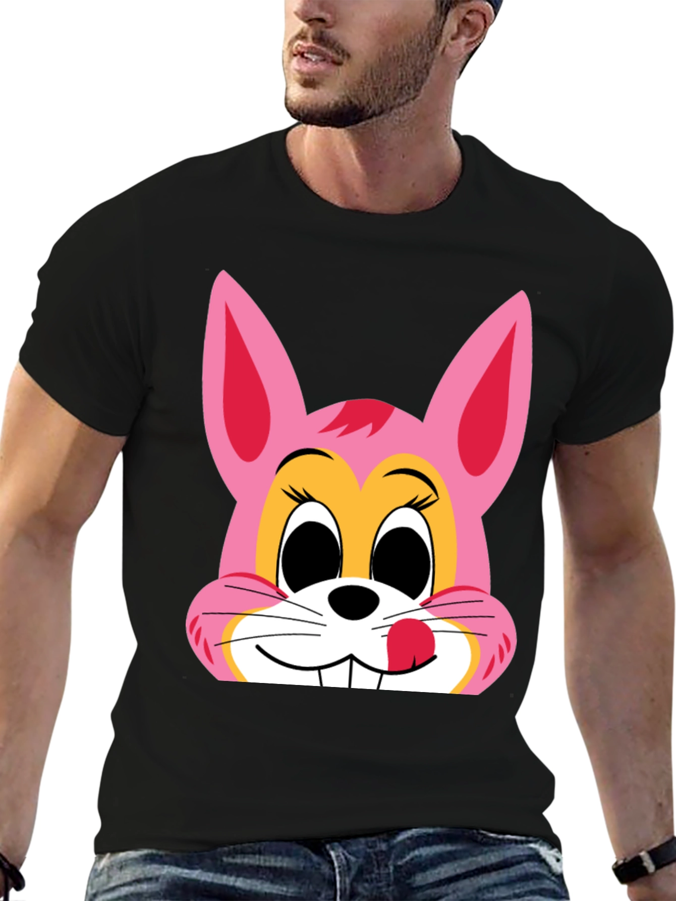 Show off your playful side with this eye-catching black t-shirt featuring a vibrant, cartoon-style bunny graphic! Made from comfortable cotton, this tee is perfect for casual wear. The bunny design features bright pink accents, a sweet expression, and a cheeky tongue-out pose, adding a fun touch to your wardrobe. This versatile t-shirt can be styled with jeans, shorts, or a skirt for a variety of looks. Ideal for anyone who loves quirky and cute designs, this tee is sure to become a favorite. Get yours today and add a pop of fun to your outfit!