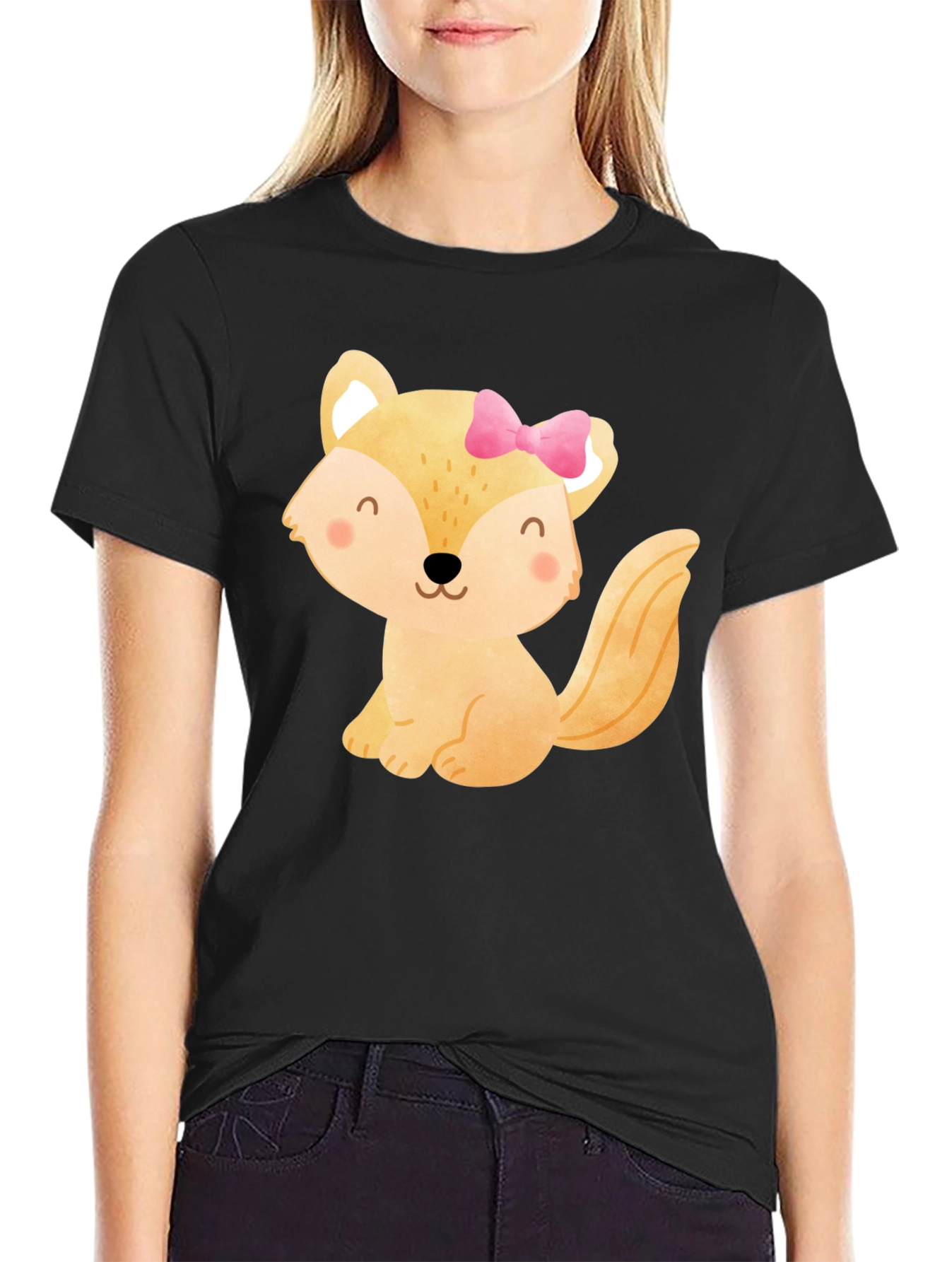 This adorable black t-shirt features a charming cartoon fox design. The fox, rendered in soft, warm colors, is depicted in a seated pose with a sweet smile, making it irresistibly cute. A delightful pink bow adds a touch of girlish charm. Made from what appears to be a soft, comfortable fabric, this t-shirt is perfect for casual wear. It's an excellent choice for anyone who loves animals or enjoys wearing unique, eye-catching designs. This t-shirt would also make a wonderful gift for a friend or family member. Get yours today and show off your love for all things cute!