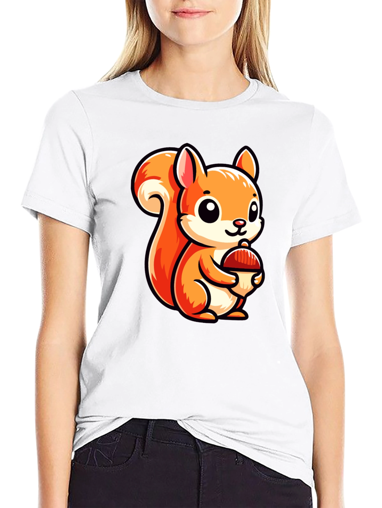 Show off your love for adorable animals with this charming t-shirt. The shirt features a delightful cartoon squirrel graphic, complete with big, expressive eyes and a bushy tail. The squirrel is clutching an acorn, adding to its cute and playful appeal. This tee is perfect for casual wear, showcasing a fun and whimsical style. The black color of the t-shirt makes the vibrant orange and white squirrel stand out, creating an eye-catching contrast. Made from comfortable materials, this t-shirt is great for everyday use, whether you're out running errands or relaxing at home. It's sure to be a conversation starter and a favorite in your wardrobe!