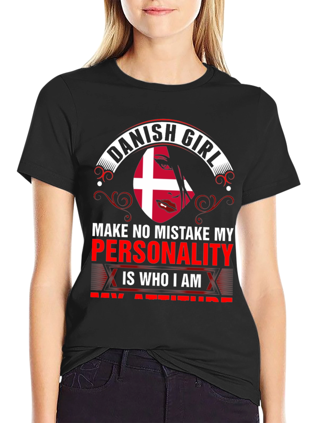 Express your unique identity with this stylish black t-shirt. Featuring a bold graphic design, the shirt showcases "DANISH GIRL" alongside a partial face graphic with a Danish flag overlay. The powerful statement "MAKE NO MISTAKE MY PERSONALITY IS WHO I AM" is printed in eye-catching red, emphasizing individuality. The shirt appears to be made from a soft, comfortable fabric, perfect for everyday wear. Ideal for casual outings, social gatherings, or as a gift for someone proud of their Danish heritage. This tee is sure to make a statement.