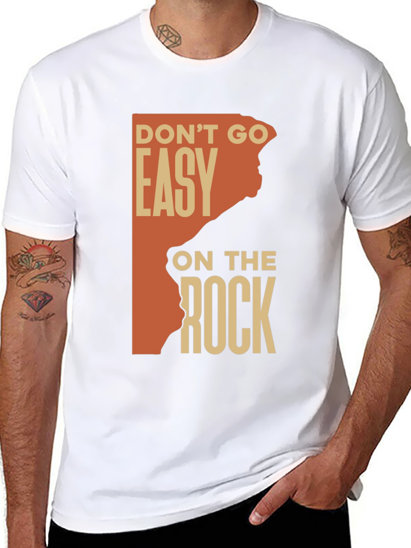 Show your love for rock climbing with this stylish graphic tee. The shirt features a bold design with the phrase "Don't Go Easy On The Rock" in contrasting colors, set against a silhouette. Made from comfortable material, this tee is perfect for casual wear or hitting the gym. Pair it with your favorite jeans for a relaxed look, or wear it to your next climbing session to inspire your best performance. Makes a great gift for climbers or anyone who loves the great outdoors!