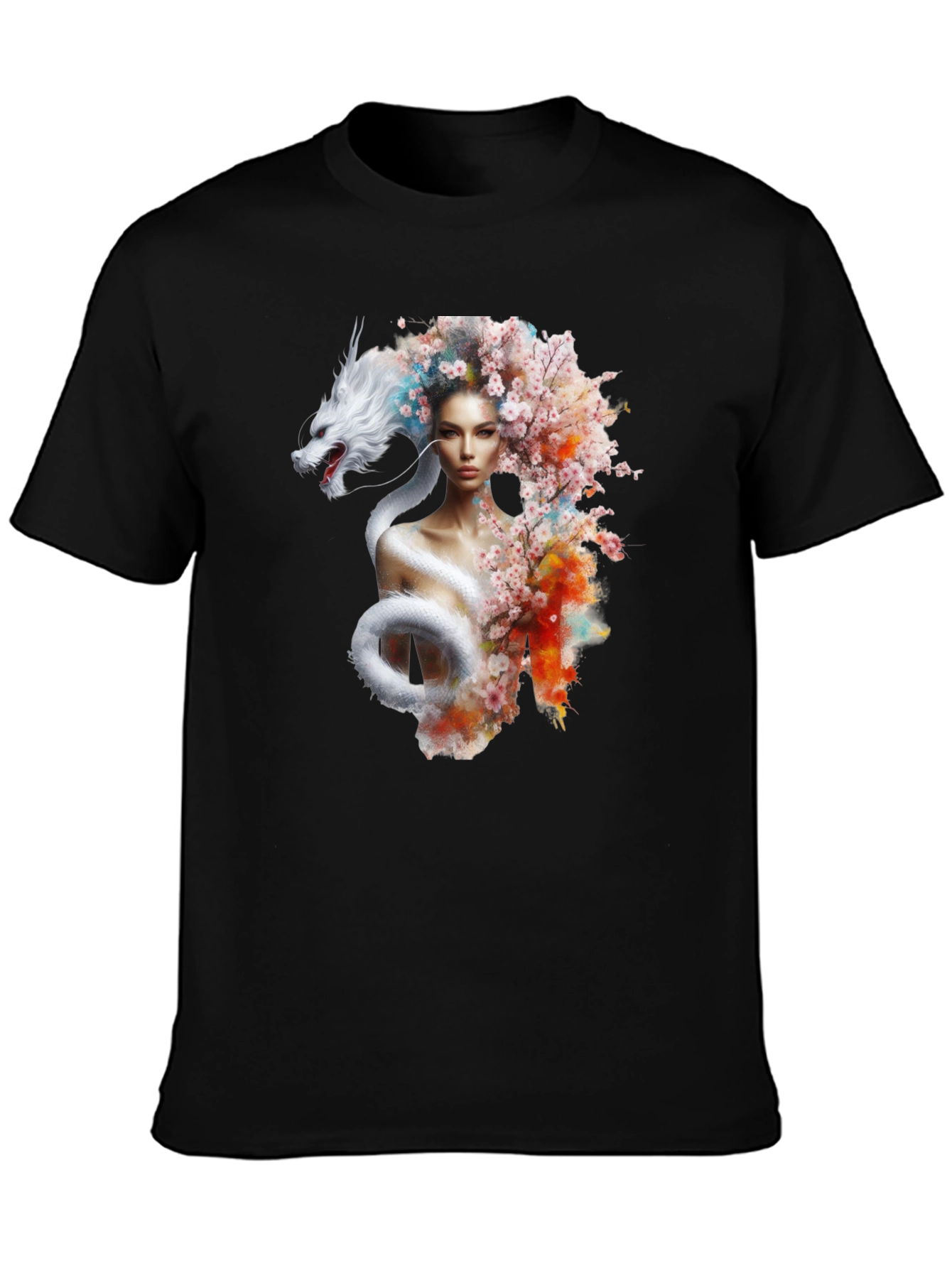 Elevate your style with this striking black t-shirt featuring a unique graphic design. The artwork showcases a mesmerizing woman intertwined with a majestic white dragon and delicate cherry blossoms. This eye-catching design is printed on a comfortable, breathable fabric, ensuring a soft feel and all-day comfort. Perfect for casual outings, concerts, or expressing your individuality. The vivid colors and intricate details make this tee a standout piece in any wardrobe. Pair it with jeans, shorts, or a skirt for a versatile, fashionable look that is sure to turn heads and spark conversations. Show off your unique style with this awesome shirt!