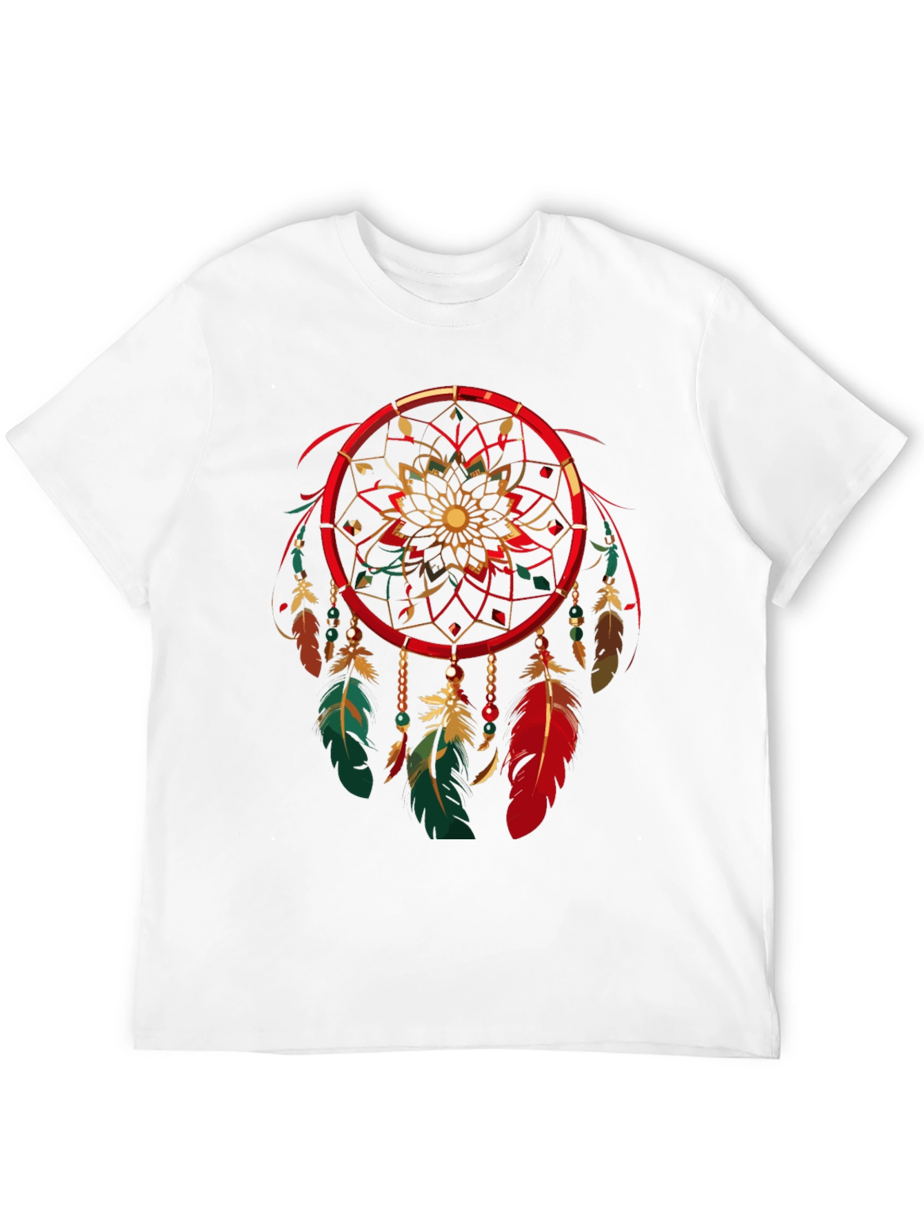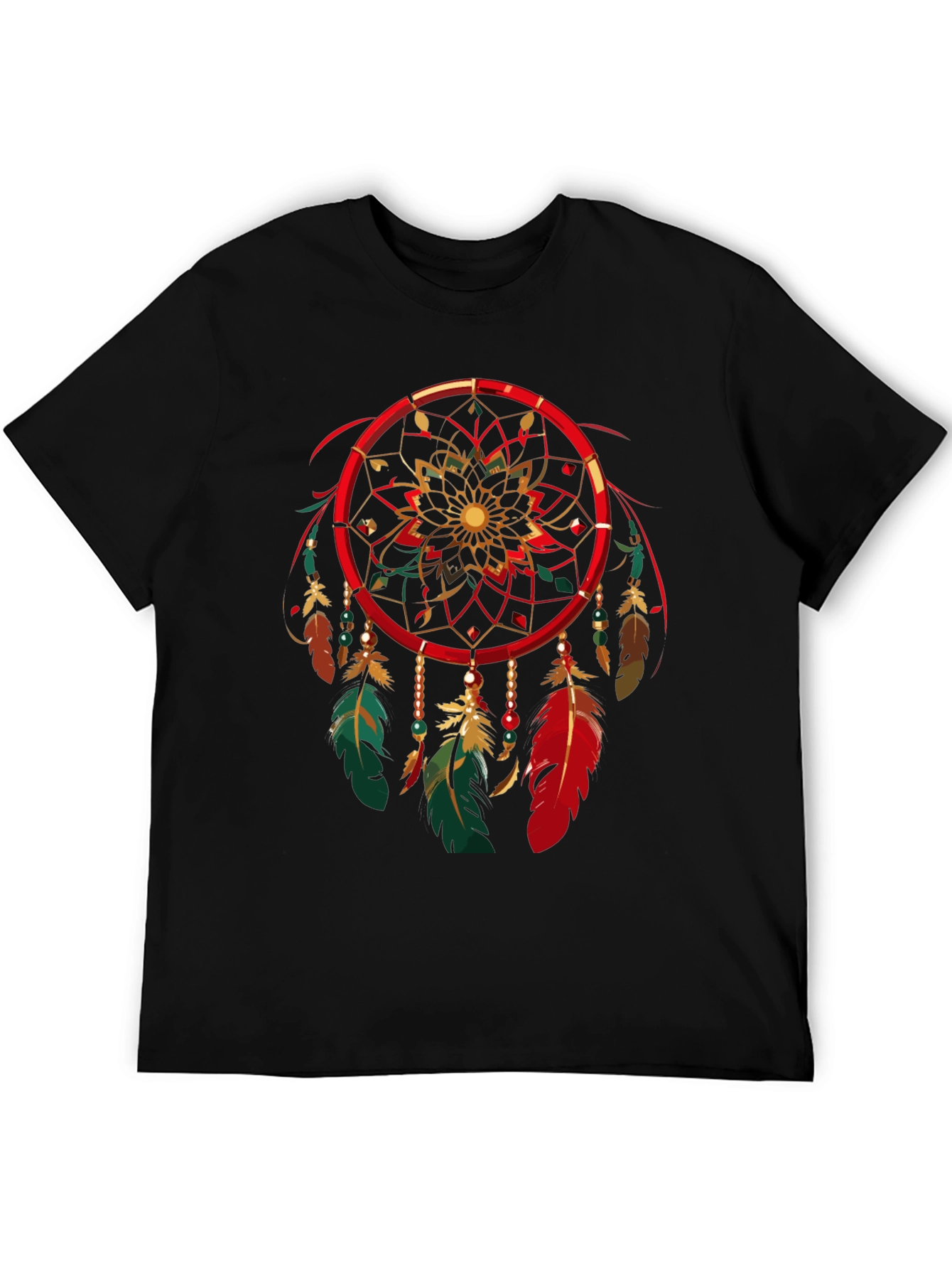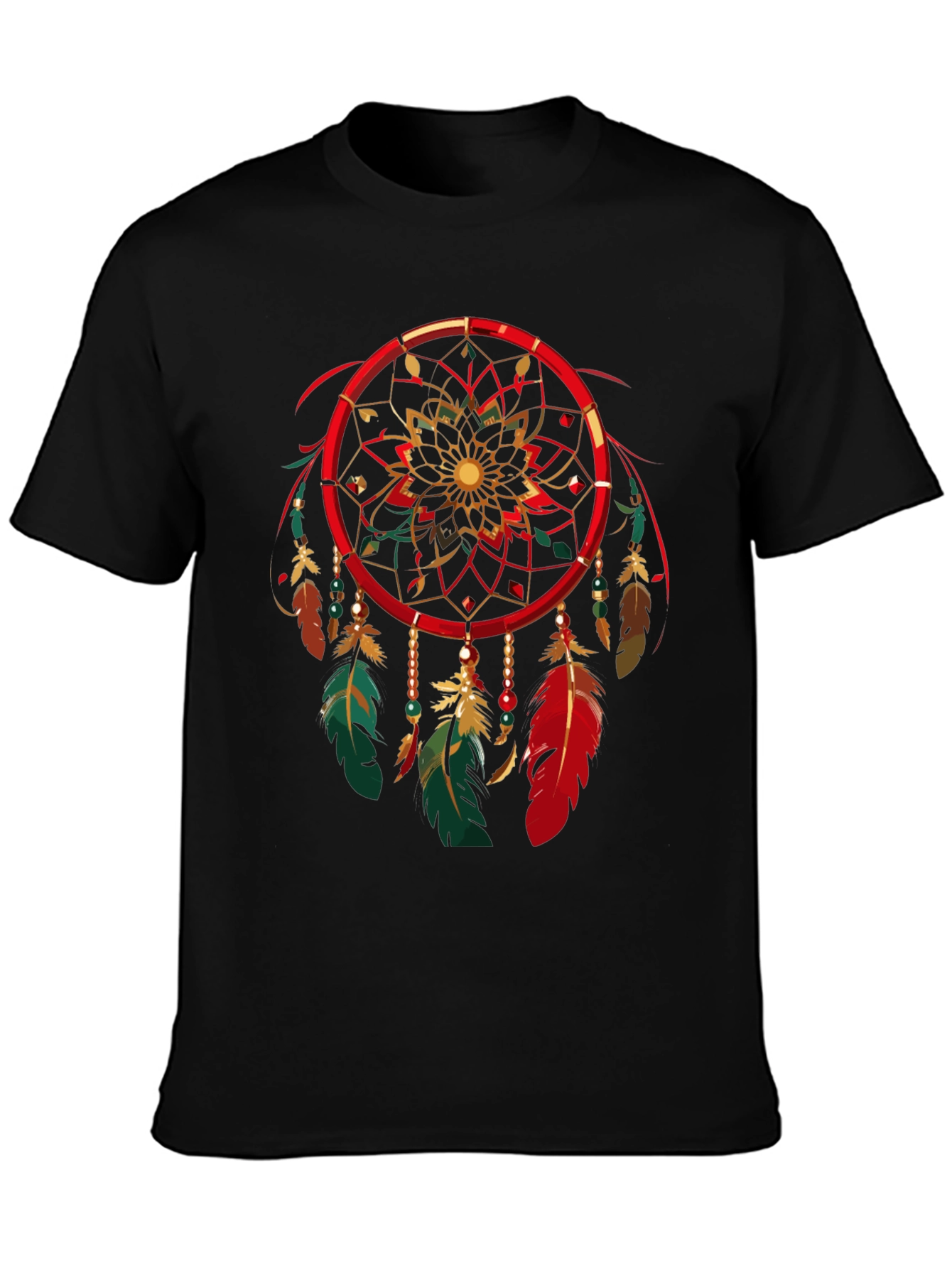 Embrace bohemian style with this eye-catching graphic t-shirt. Featuring a vibrant dream catcher design, complete with intricate webs, colorful feathers, and decorative beads, this tee is perfect for expressing your free-spirited side. The design is printed on a soft, comfortable black fabric, offering a relaxed fit for everyday wear. Ideal for casual outings, music festivals, or simply lounging at home, this t-shirt adds a touch of artistic flair to any outfit. Show off your unique personality with this trendy and comfortable statement piece.