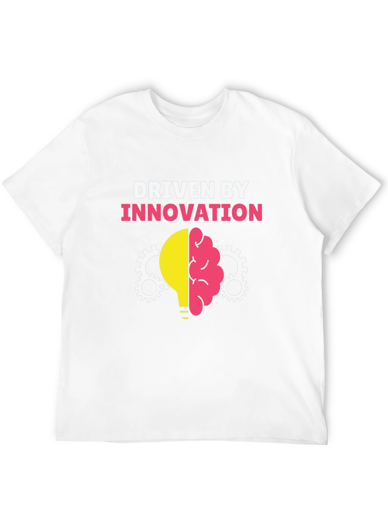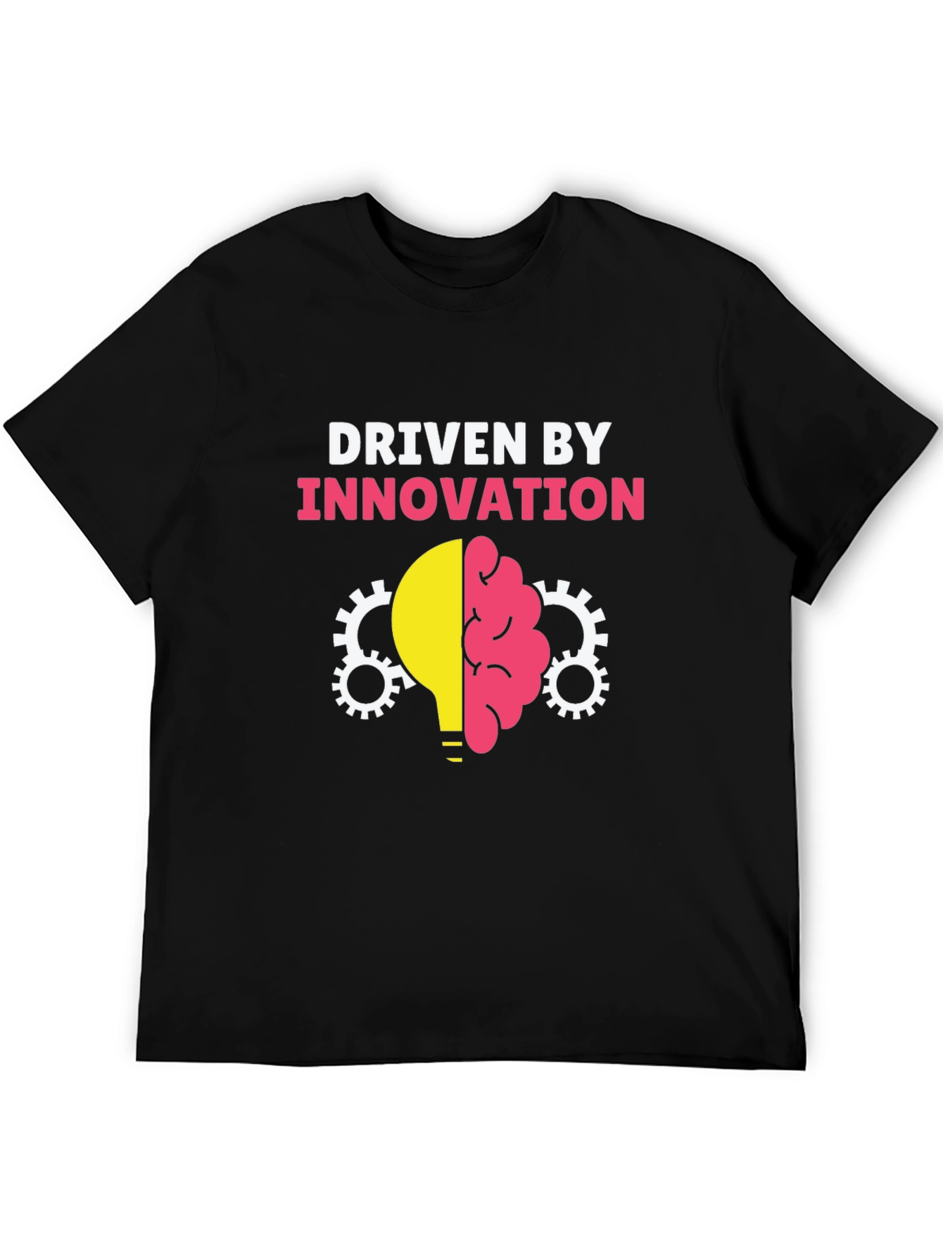 Showcase your innovative mindset with this stylish black t-shirt. The design features the phrase "Driven by Innovation" printed in bold lettering, with "Innovation" highlighted in pink. A creative graphic of a half brain/half lightbulb with gears adds a visually appealing touch. Crafted from comfortable fabric, this tee is perfect for casual wear, team meetings, or tech conferences. A great conversation starter and a unique way to express your passion for forward-thinking ideas. Wear it proudly and inspire those around you!