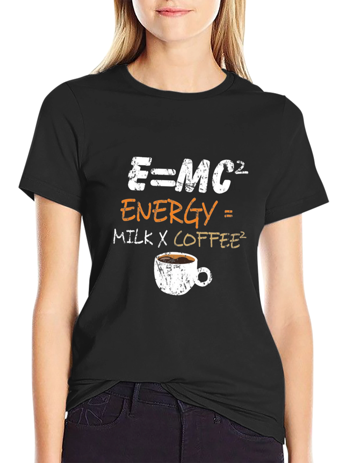 This black t-shirt features a humorous play on Einstein's famous equation, replacing it with a coffee-themed formula. The design displays E=MC², with 'ENERGY' in orange above 'MILK x COFFEE²' in white, accompanied by a white mug of coffee. The tee is perfect for science enthusiasts, coffee lovers, or anyone with a fun sense of humor. It's a unique conversation starter and a comfortable addition to your casual wardrobe. Wear it to school, work, coffee shops, or anywhere you want to express your interests with a touch of wit. Ideal for gifting!