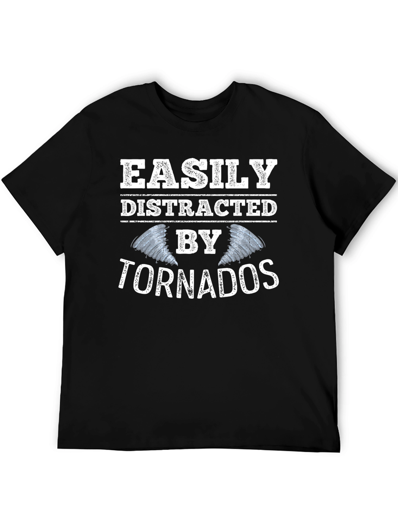 Show off your unique sense of humor with this eye-catching "Easily Distracted By Tornadoes" graphic tee! Crafted from a comfortable, breathable black fabric, this short-sleeved shirt features a bold, distressed white print. The playful text is accompanied by detailed tornado illustrations, adding a touch of whimsy to the design. Perfect for casual outings, weekend adventures, or just lounging at home, this t-shirt is sure to spark conversations and turn heads. The relaxed fit makes it ideal for everyday wear, while the durable construction ensures lasting quality. Whether you're a storm chaser at heart or simply appreciate a good joke, this t-shirt is a must-have addition to your wardrobe.