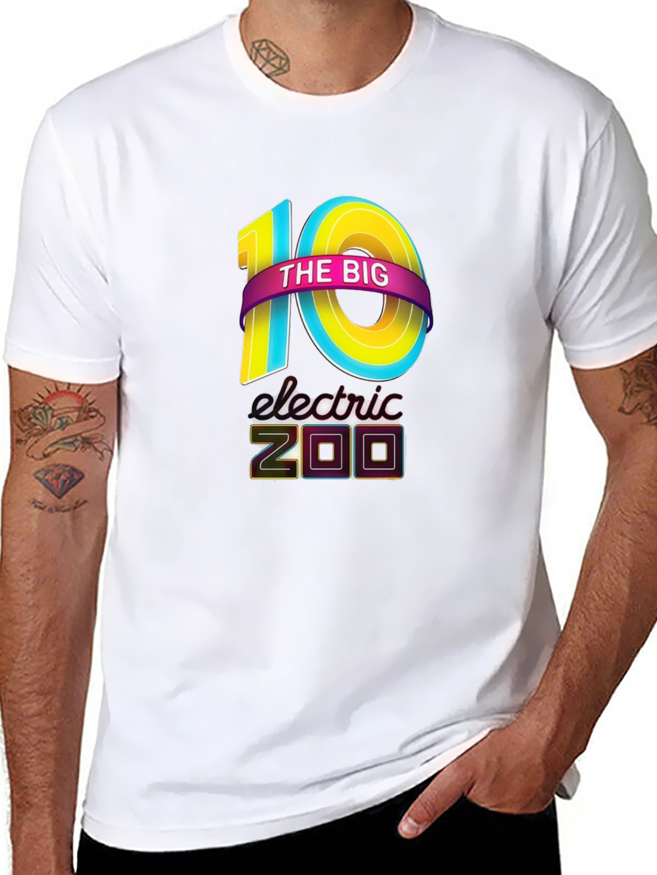 Show off your love for Electric Zoo with this vibrant black t-shirt. The tee features a bold graphic design with the number '10' stylized in eye-catching blue and yellow, overlaid with a pink banner proclaiming 'THE BIG'. Below, the words 'electric ZOO' complete the design in a retro, neon-outlined font, making this shirt a must-have for any fan. Made from a comfortable, breathable fabric, this short-sleeved t-shirt is perfect for everyday wear or for rocking out at your favorite music festival. Whether you're reliving memories or just love the vibrant design, this Electric Zoo tee is sure to turn heads and spark conversations. Get yours today and celebrate the electrifying spirit of the festival!
