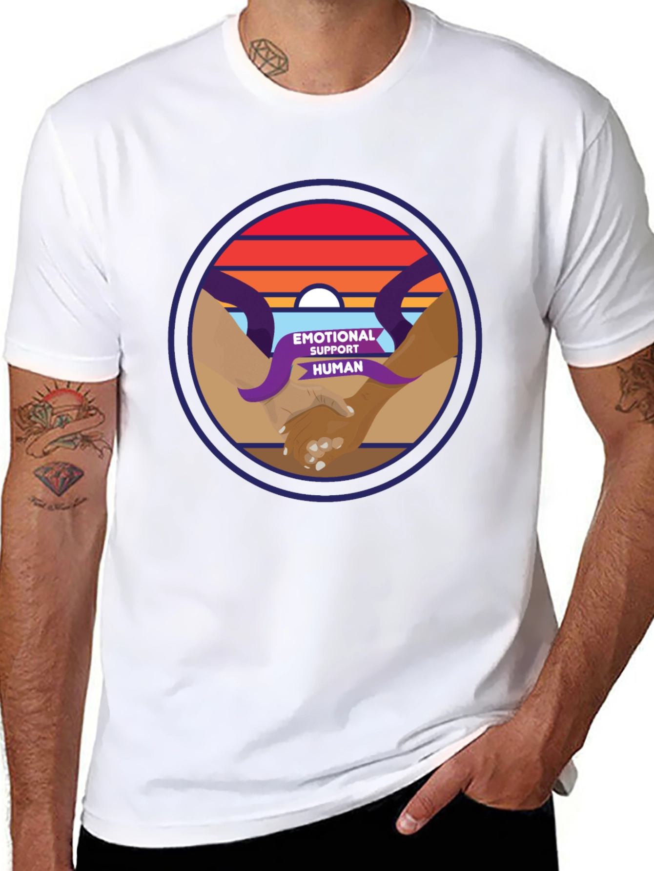 This eye-catching black t-shirt features a unique graphic design. The central circular emblem showcases diverse hands gently clasped, enveloped by supportive purple tentacles. Above, a vibrant sunset design adds warmth and depth. The words 'Emotional Support Human' complete the thoughtful graphic. Made from comfortable, breathable fabric, this tee is perfect for everyday wear, casual outings, or as a meaningful gift. Show your support and spread positivity with this stylish and meaningful shirt. It's a great conversation starter and a reminder of the importance of human connection.