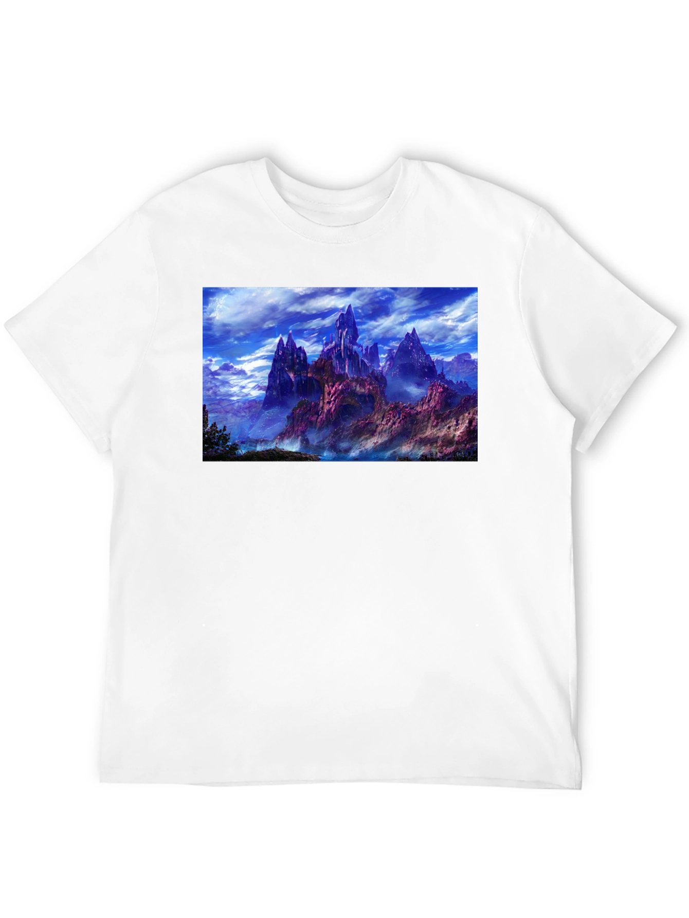 Show off your unique style with this striking black t-shirt, featuring a vivid graphic print of a fantasy landscape. The design captures a majestic mountain range under a dynamic sky, complete with vibrant colors. This shirt is perfect for everyday wear, casual outings, or as a standout piece in your wardrobe. Made from comfortable materials, it ensures breathability and a great fit. Elevate your look with this eye-catching t-shirt that blends art and fashion seamlessly, making it a must-have for fantasy art enthusiasts and anyone looking to make a bold statement.