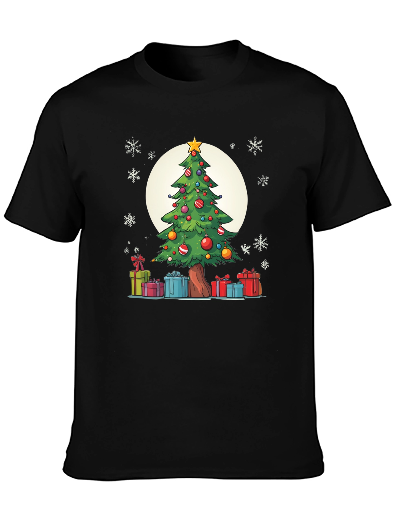 Get ready for the holidays with this fun Christmas tree t-shirt! The shirt features a vibrant cartoon-style Christmas tree adorned with colorful ornaments and a bright yellow star, centered against a soft white backdrop. Below the tree, you'll find a delightful array of presents, adding to the festive cheer. The design is perfect for casual holiday gatherings, Christmas parties, or just spreading joy throughout the season. Made from comfortable materials, this shirt is sure to bring a smile to everyone's face and is a great conversation starter. Celebrate the season in style with this unique Christmas tee!