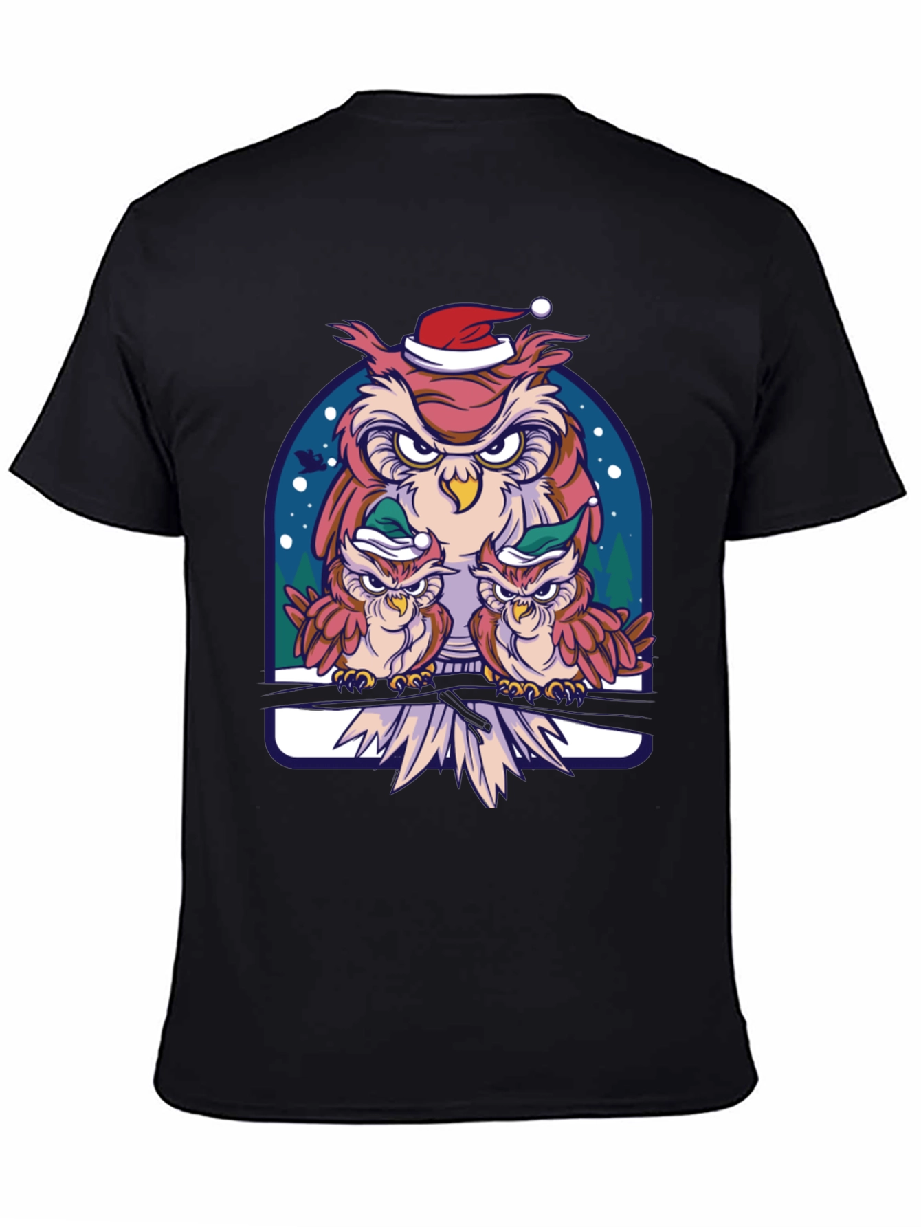 Spread holiday cheer with this unique owl-themed graphic tee! Featuring a charming illustration of a mother owl and two owlets, all adorably adorned with Santa hats, this shirt is perfect for celebrating the festive season in style. The design is set against a wintery forest backdrop, adding to the whimsical and joyful vibe. Made from a soft, comfortable fabric, this t-shirt ensures a cozy fit for all-day wear. The design is printed with high-quality inks for long-lasting vibrancy. Ideal for holiday parties, family gatherings, or simply showing off your love for these wise, nocturnal birds. A must-have for owl enthusiasts and anyone who loves to embrace the holiday spirit!