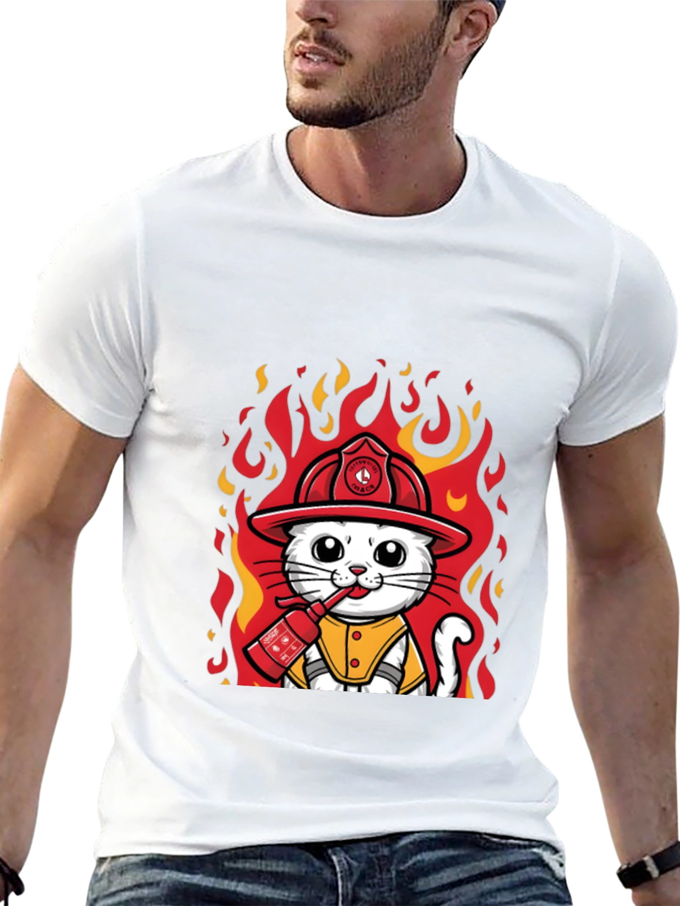 This unique t-shirt features a cute, cartoon-style cat dressed as a firefighter, complete with a red helmet and uniform. The design incorporates vibrant red and yellow flames as a backdrop, giving it a bold and eye-catching look. The cat is humorously depicted with a bottle, adding a playful twist to the firefighter theme. Made from what appears to be a soft and comfortable fabric, this t-shirt is perfect for casual wear, cat lovers, or anyone who appreciates a fun and quirky design. Show off your love for cats and unique style with this conversation-starting tee!