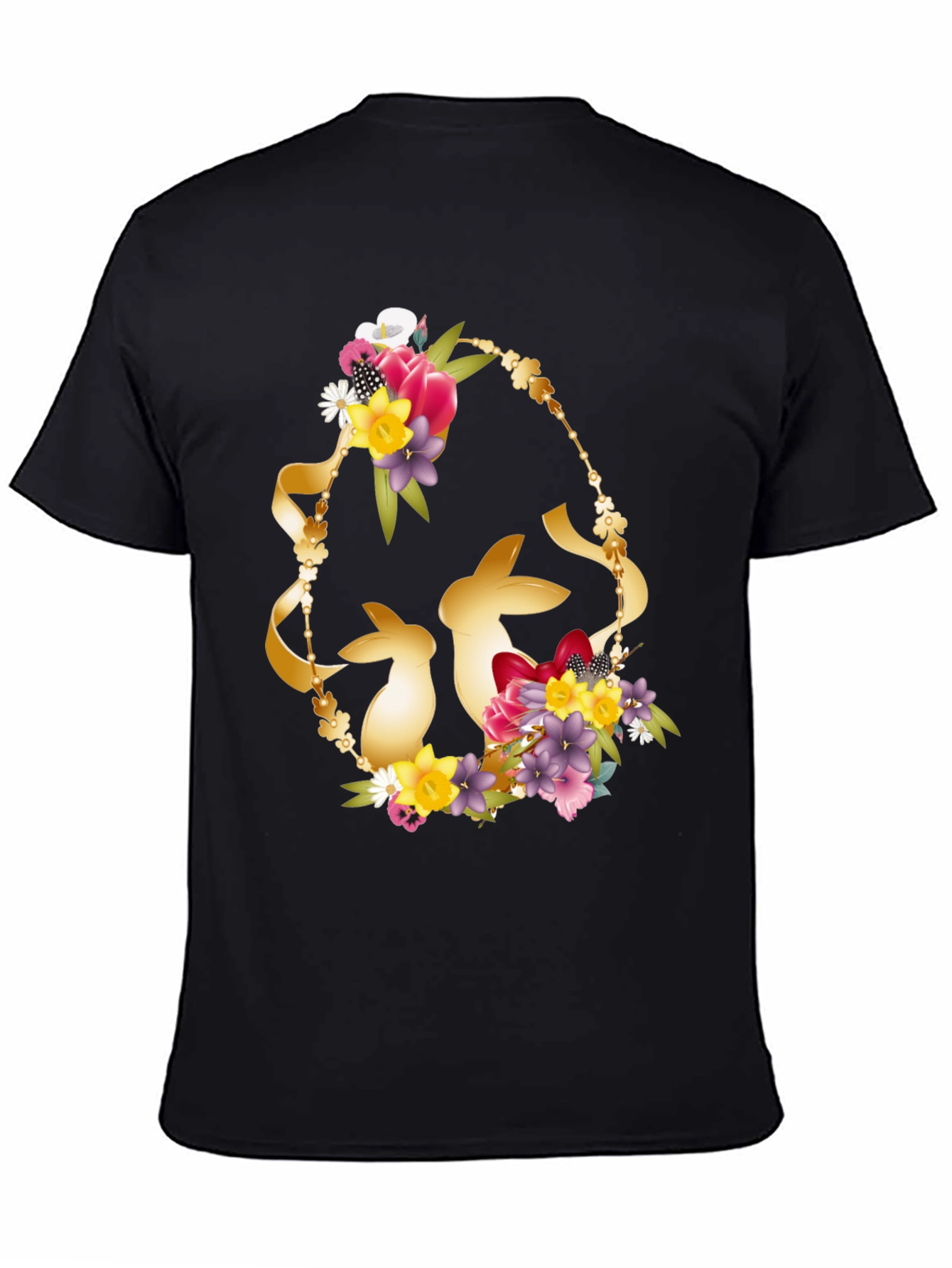 Celebrate Easter in style with this unique graphic t-shirt. The design features a beautiful arrangement of flowers and ribbons shaped like an egg with two cute golden bunnies inside. This fun print is perfect for Easter celebrations and springtime festivities. Made from a comfortable, breathable fabric, this tee is ideal for casual wear. Dress it up or down for any occasion. Add a touch of spring to your wardrobe with this charming and festive t-shirt!