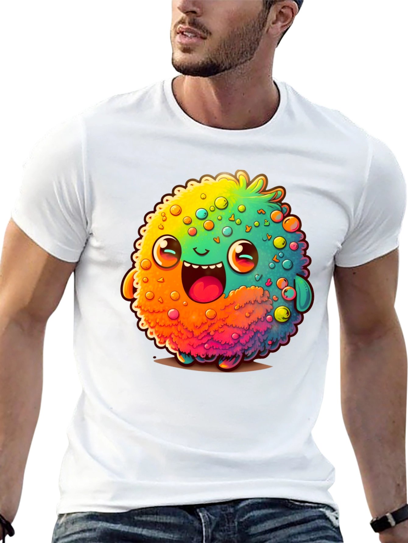 Add a playful touch to your wardrobe with this unique black t-shirt. Featuring a vibrant, cartoon-style monster graphic with a happy expression, this tee is sure to turn heads. The design boasts a colorful, textured appearance and a joyful vibe. Made from a comfortable-looking fabric, it's perfect for casual wear, social outings, or adding a fun twist to your everyday style. The high-quality print ensures that the design remains bright and eye-catching, wash after wash. Express your fun side with this awesome monster tee!