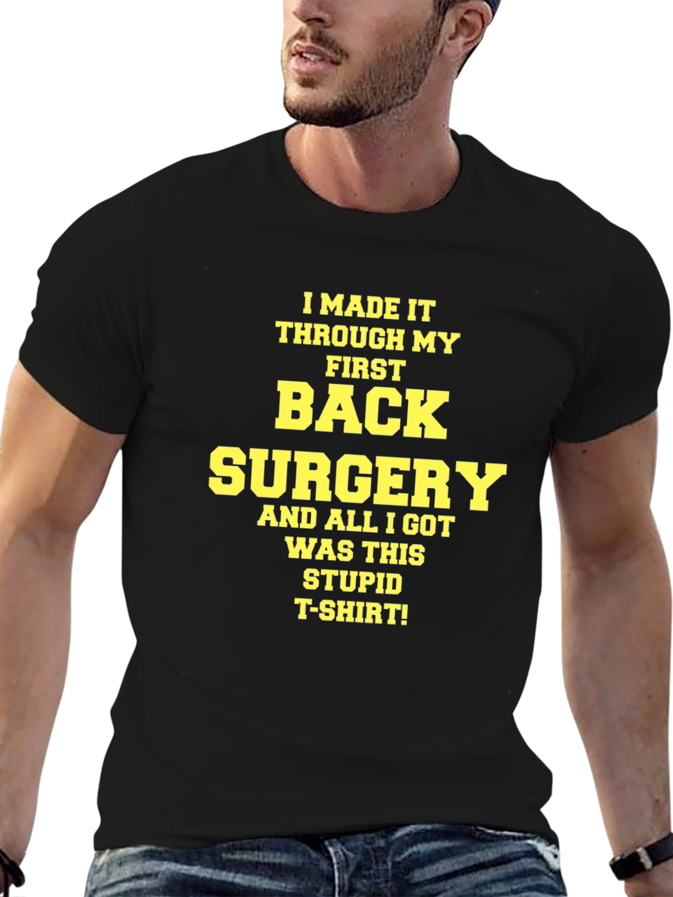 Show off your recovery with this humorous black t-shirt. The shirt features bold yellow text stating "I Made It Through My First Back Surgery And All I Got Was This Stupid T-Shirt!". Perfect for back surgery survivors, this tee adds a touch of levity to the recovery process. It’s a comfortable way to share your story and get a laugh. Wear it proudly to doctor appointments, physical therapy, or just around town. A great conversation starter and a fun gift idea for anyone who has undergone back surgery.
