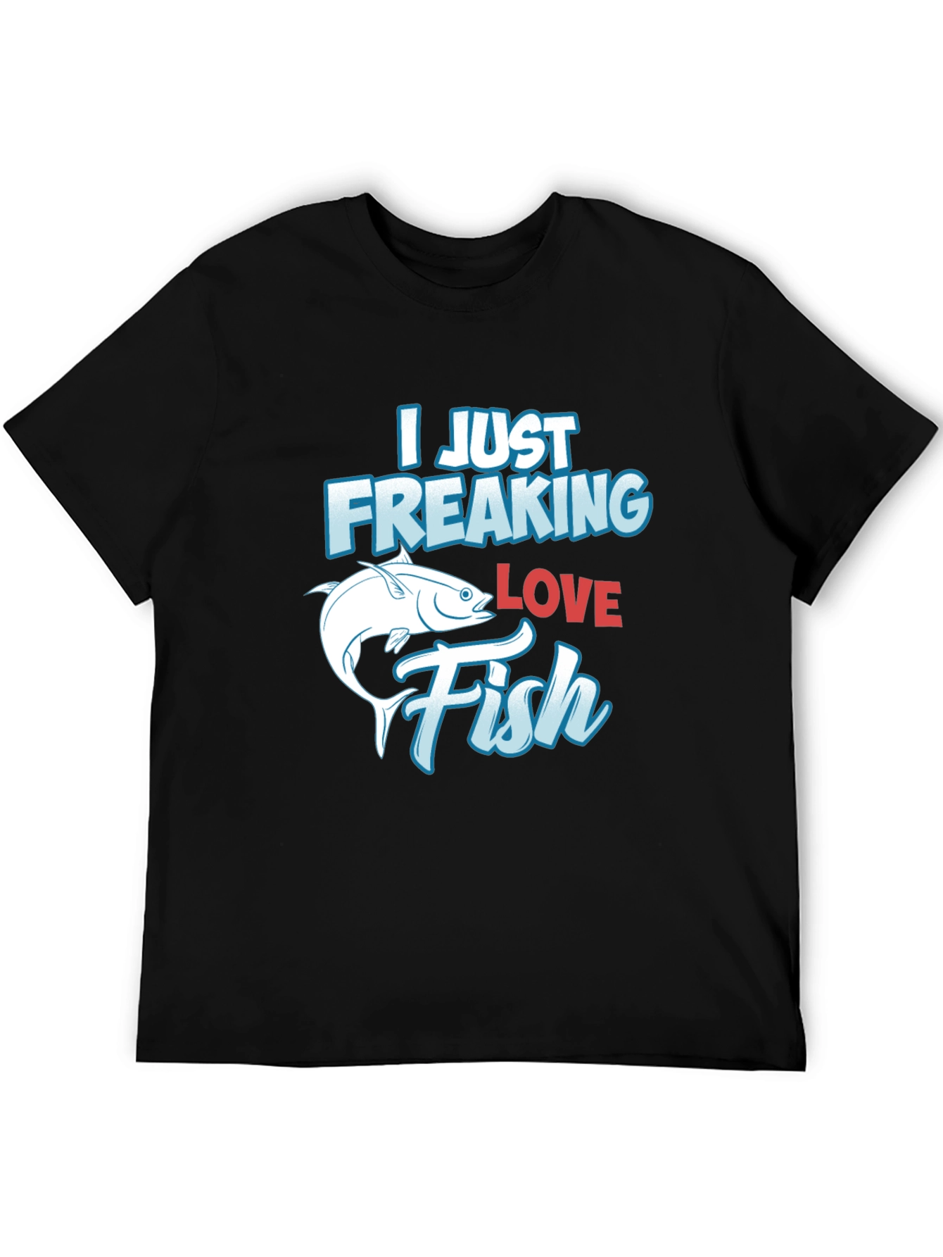Show off your love for fishing with this eye-catching black t-shirt! The bold design features the phrase "I Just Freaking Love Fish" in a playful font with a white fish graphic. This tee is made from what appears to be a soft and breathable fabric, perfect for everyday wear or your next fishing trip. It's a great conversation starter and a fun way to express your passion for angling. Grab yours today and let everyone know how much you love fish!