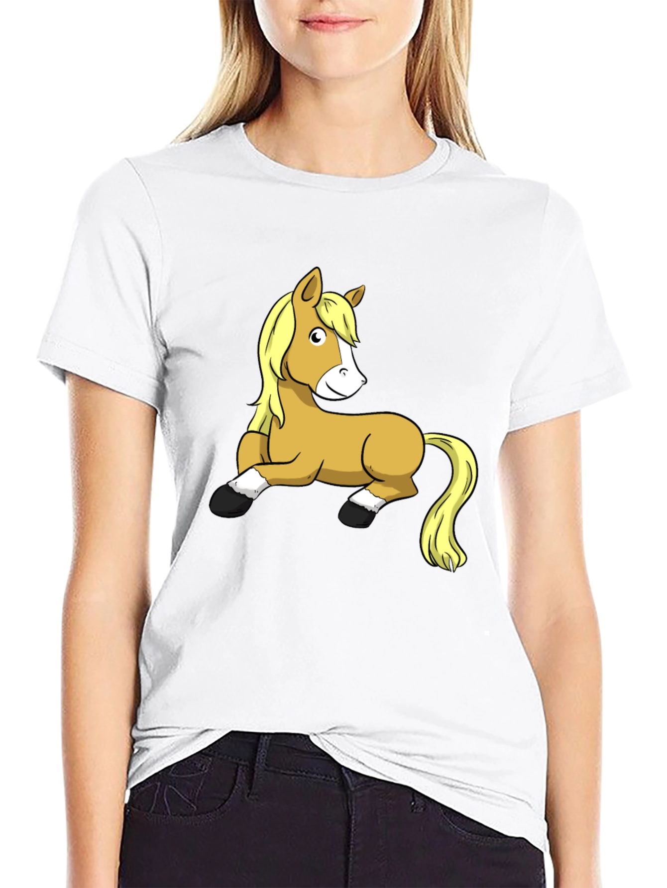 Show off your love for horses with this unique graphic tee! This black t-shirt features a playful cartoon horse design, making it a fun and eye-catching addition to your wardrobe. Crafted from soft, breathable cotton, this shirt offers all-day comfort. The design showcases a cute, cartoon-style horse, perfect for casual outings, equestrian events, or simply lounging at home. Pair it with jeans, shorts, or your favorite riding pants for a stylish look. This tee is sure to bring a smile to anyone's face, whether they're a horse enthusiast or just appreciate a touch of whimsy. Add this fun tee to your collection today!