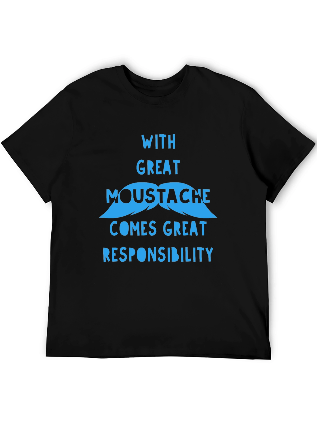 This black t-shirt features a humorous design with the phrase "With Great Moustache Comes Great Responsibility" printed in blue. The design incorporates a stylized mustache graphic, adding a playful touch. Made from a comfortable-looking material, this shirt is perfect for casual wear. The shirt appears to be a standard fit and would be ideal for anyone with a sense of humor or a love for facial hair. It would be great for everyday wear or as a fun gift for a friend or family member.