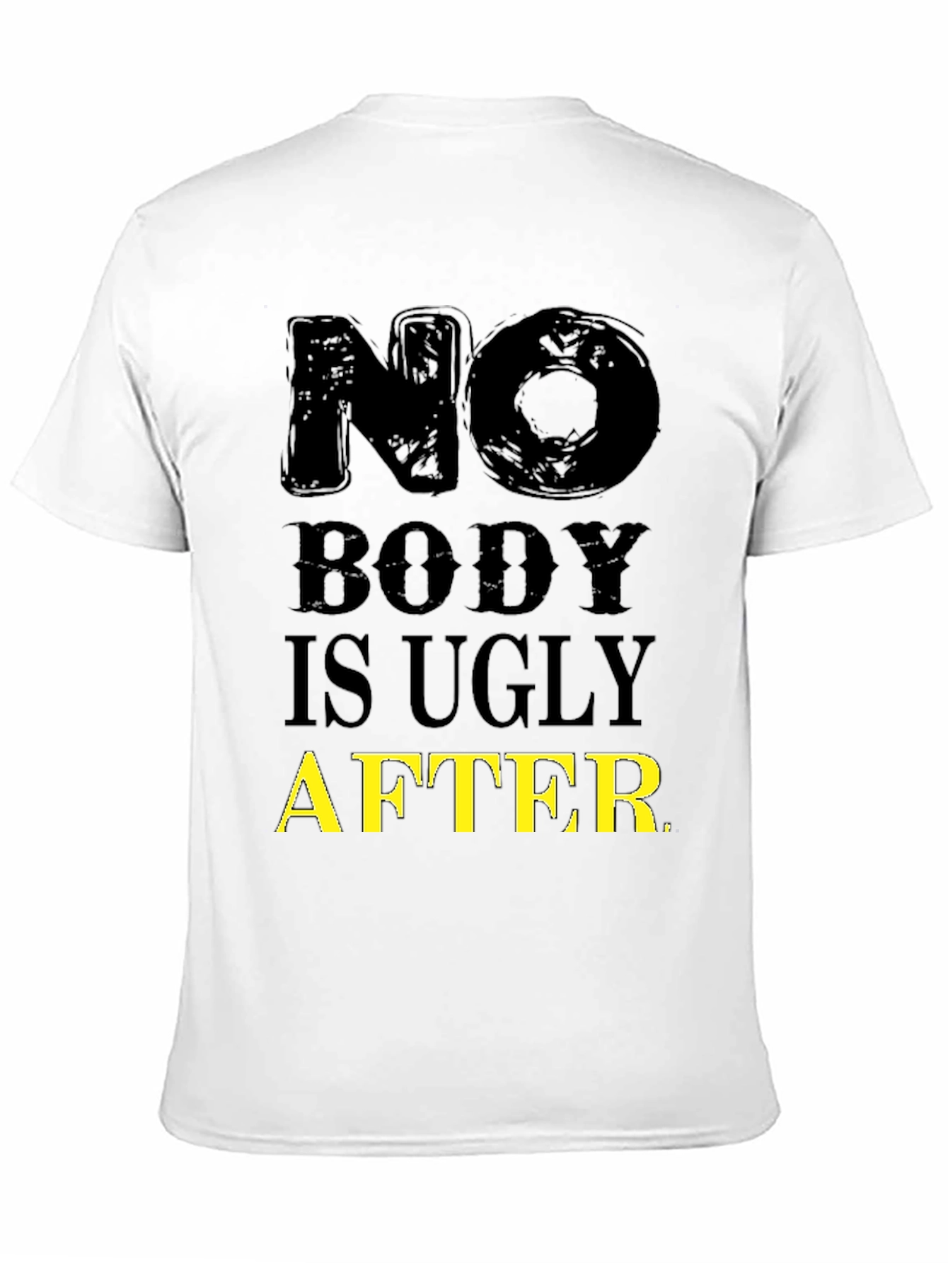 Show off your sense of humor with this statement t-shirt. This black t-shirt features the phrase "NO BODY IS UGLY AFTER." in a distressed block font, with the word 'AFTER.' in yellow. The short-sleeve, crewneck design offers a comfortable fit, and the humorous message makes it a great conversation starter. Perfect for casual outings, gym sessions, or just lounging around, this t-shirt adds a fun touch to any outfit. Express yourself with this eye-catching graphic tee!