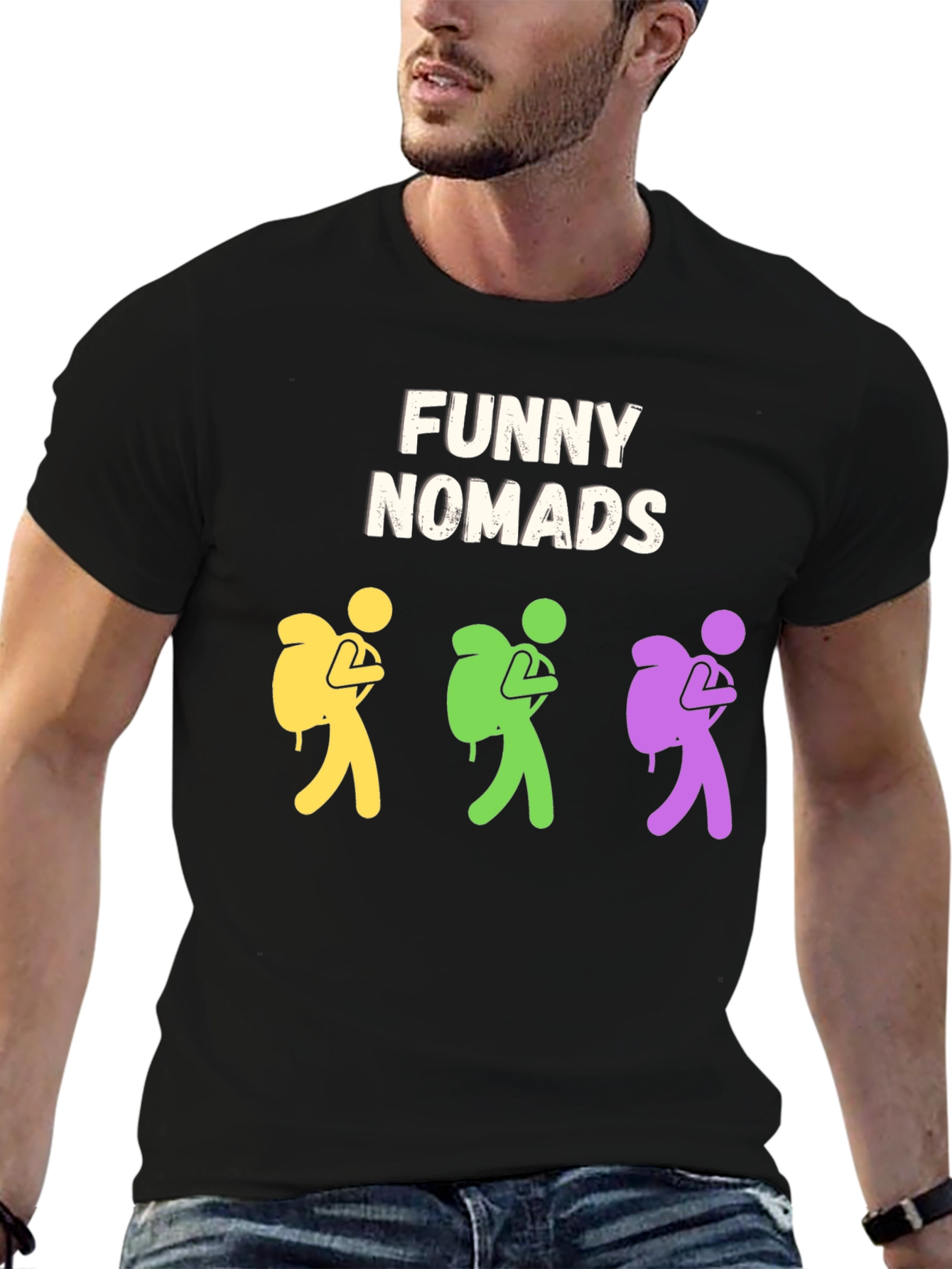 Showcase your adventurous spirit with this unique black T-shirt! Featuring a playful design of three stick-figure nomads in yellow, green, and purple, complete with backpacks, this tee is sure to spark conversations. The design is printed in a high-quality finish, ensuring it stands out against the classic black background. Crafted from a comfortable, breathable fabric, this shirt is perfect for everyday wear or your next outdoor adventure. The text 'FUNNY NOMADS' adds a touch of humor. Whether you're hitting the trails or just hanging out, this shirt is a fun way to express your wanderlust. Get yours today and embrace the nomad life!