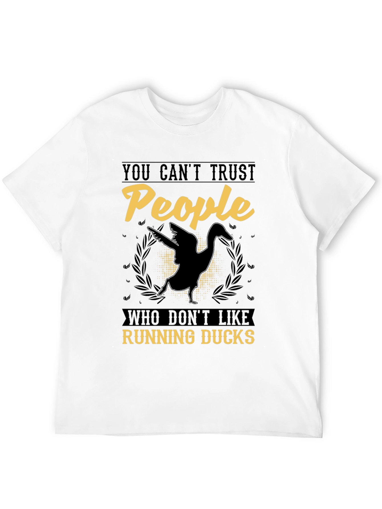 This black t-shirt features a humorous graphic design that's sure to spark conversation. The design includes the phrase 'You Can't Trust People Who Don't Like Running Ducks' in a bold, yellow font. A silhouetted duck is featured in the center. Made from a comfortable material, this tee is perfect for casual wear. It's a fun addition to any wardrobe and makes a great gift for duck lovers or anyone with a sense of humor. Wear it to the park, social gatherings, or just lounging around at home. Get ready to turn heads and spread some laughter with this unique t-shirt!