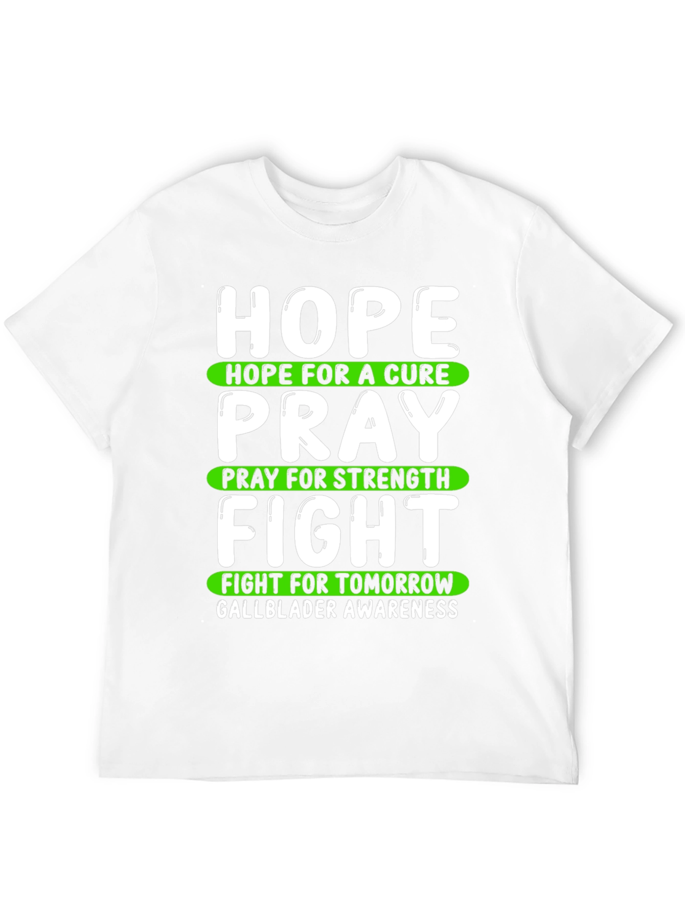 Show your support with this black t-shirt featuring a powerful message. The design includes the words "HOPE," "PRAY," and "FIGHT" in bold white font, separated by horizontal green bars. Below each word are related phrases such as "HOPE FOR A CURE", "PRAY FOR STRENGTH" and "FIGHT FOR TOMORROW" respectively. At the bottom, the shirt declares "GALLBLADER AWARENESS", making it a statement piece for supporting the cause. Made from comfortable fabric, this t-shirt is ideal for awareness events, casual wear, or as a thoughtful gift for those affected by gallbladder issues. Wear your support proudly and spread the message!