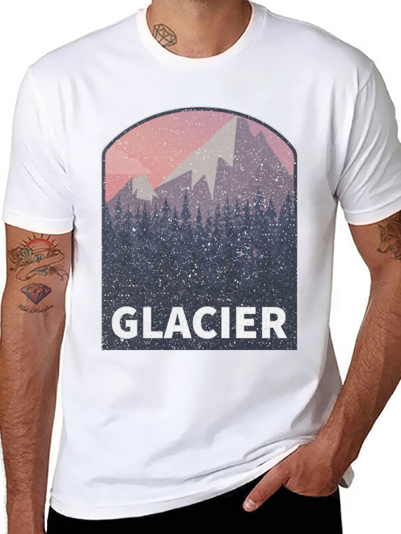 Embrace the spirit of adventure with this stylish Glacier graphic t-shirt. Crafted from a soft, breathable fabric, this tee features a unique mountain design with a vintage-inspired aesthetic. The graphic showcases majestic peaks, a dense forest, and a serene sky, all rendered in a muted, artistic style. Perfect for outdoor enthusiasts, hikers, or anyone who loves nature-themed apparel, this tee combines comfort and style effortlessly. Pair it with jeans for a casual look or layer it under a jacket for cooler weather. Show your love for the great outdoors with this must-have graphic tee. Available in black.