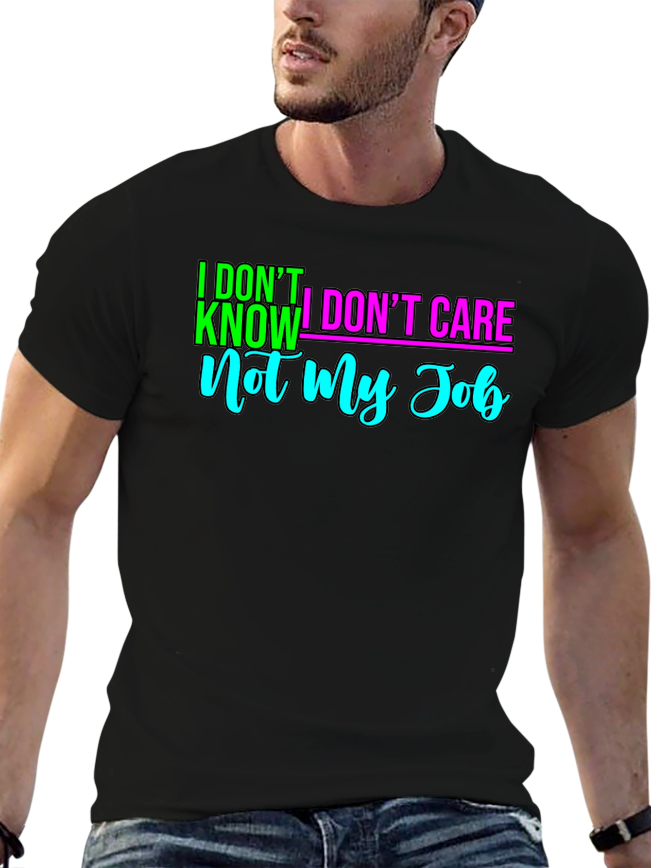 Show your playful side with this eye-catching black t-shirt. The bold statement, "I DON'T KNOW I DON'T CARE Not My Job" is emblazoned across the chest in vibrant neon green, magenta, and turquoise. This casual tee is perfect for everyday wear, relaxed weekends, or making a statement at social gatherings. Its classic fit and soft fabric ensure all-day comfort. It's sure to be a conversation starter and a fun way to express your unique personality. A great gift for those with a sense of humor!