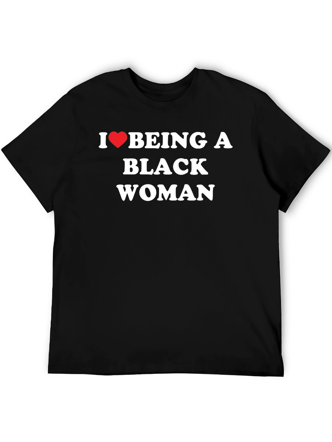 Show your pride with this statement t-shirt! The black tee features a bold, white text design that reads "I [heart symbol] BEING A BLACK WOMAN." The heart symbol is a vibrant red, adding a pop of color to the design. This classic crew-neck style shirt is a comfortable and stylish way to express your identity and celebrate Black womanhood. Perfect for everyday wear, special events, or as a thoughtful gift. The shirt's simple yet powerful message makes it a great conversation starter and a perfect addition to any wardrobe.