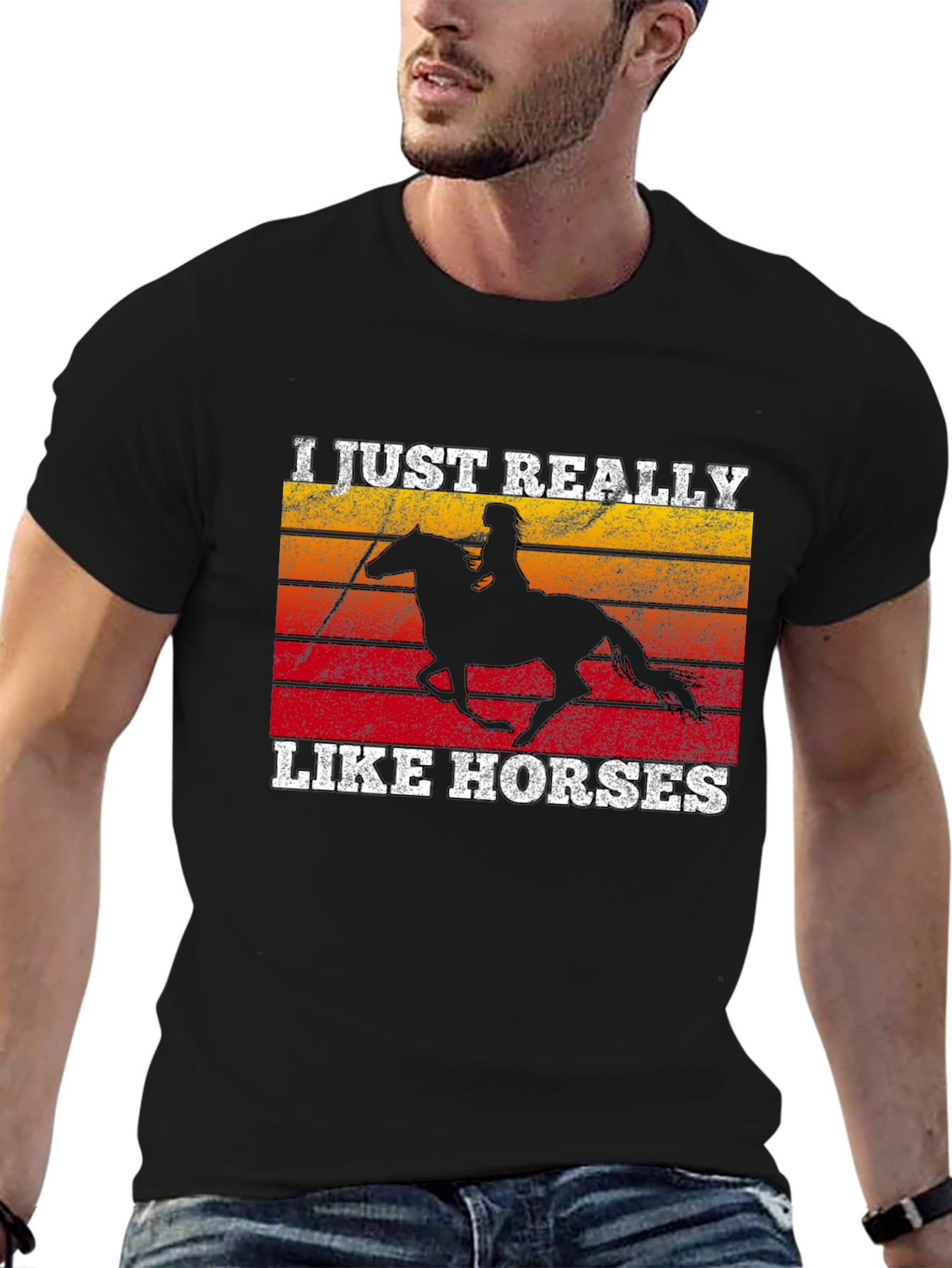 Show your love for horses with this classic black tee! This short-sleeve shirt features a bold graphic design with the phrase "I Just Really Like Horses" overlaid on a retro-style sunset background with a horse and rider silhouette. The design blends vintage charm with modern comfort, making it a great addition to any casual wardrobe. Made from soft, breathable fabric, this tee is perfect for everyday wear. Whether you're hitting the stables, running errands, or just relaxing at home, this t-shirt will keep you comfortable and stylish. It���s a must-have for any horse enthusiast!
