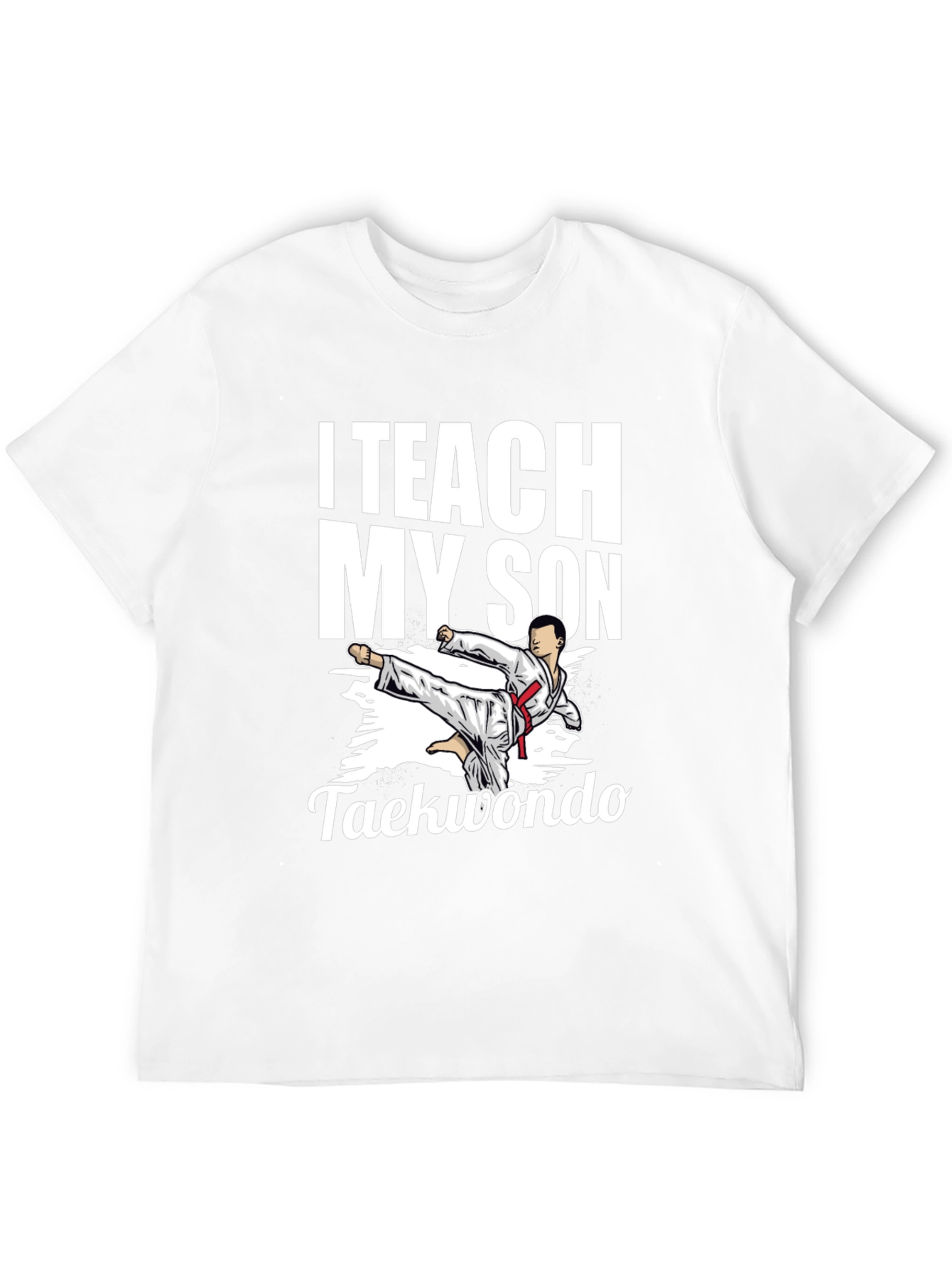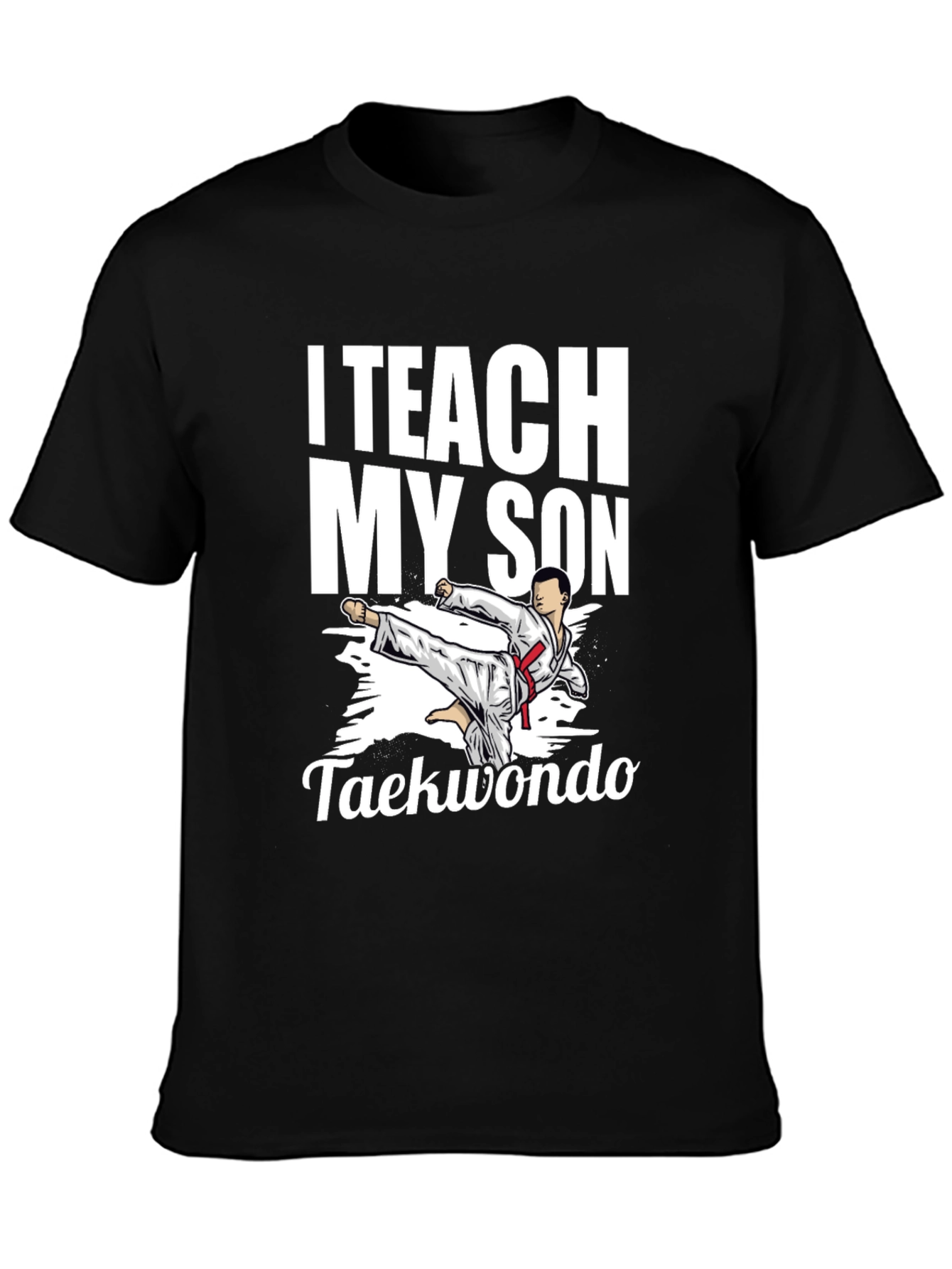 Showcase your pride with this black graphic tee featuring the bold statement 'I TEACH MY SON' above an action-packed illustration of a Taekwondo practitioner. Crafted from comfortable, breathable fabric, this shirt offers both style and comfort. The eye-catching design makes it a great conversation starter. Perfect for Taekwondo instructors, supportive parents, or anyone who loves martial arts. Wear it to training sessions, family outings, or casual events to express your passion. A unique and meaningful gift idea for fathers who teach their sons the art of Taekwondo.