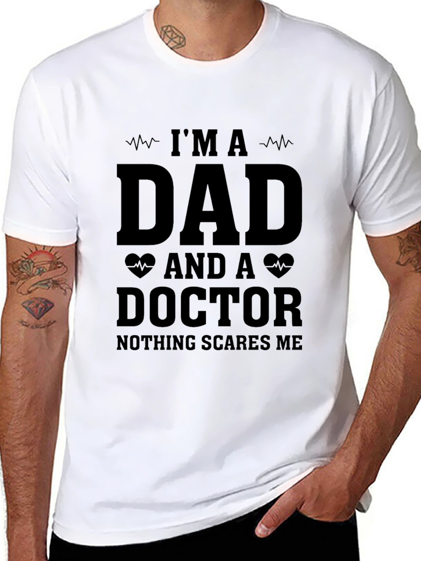 Show off your pride in being both a dad and a doctor with this cool graphic t-shirt. This black tee features bold lettering, with the phrase "I'm A Dad and A Doctor Nothing Scares Me." The hearts and heartbeat graphics add a playful touch. Comfortable and casual, this shirt is ideal for everyday wear, whether you're at work, running errands, or spending time with family. A perfect gift for the multitasking father in your life, this shirt is sure to become a favorite.