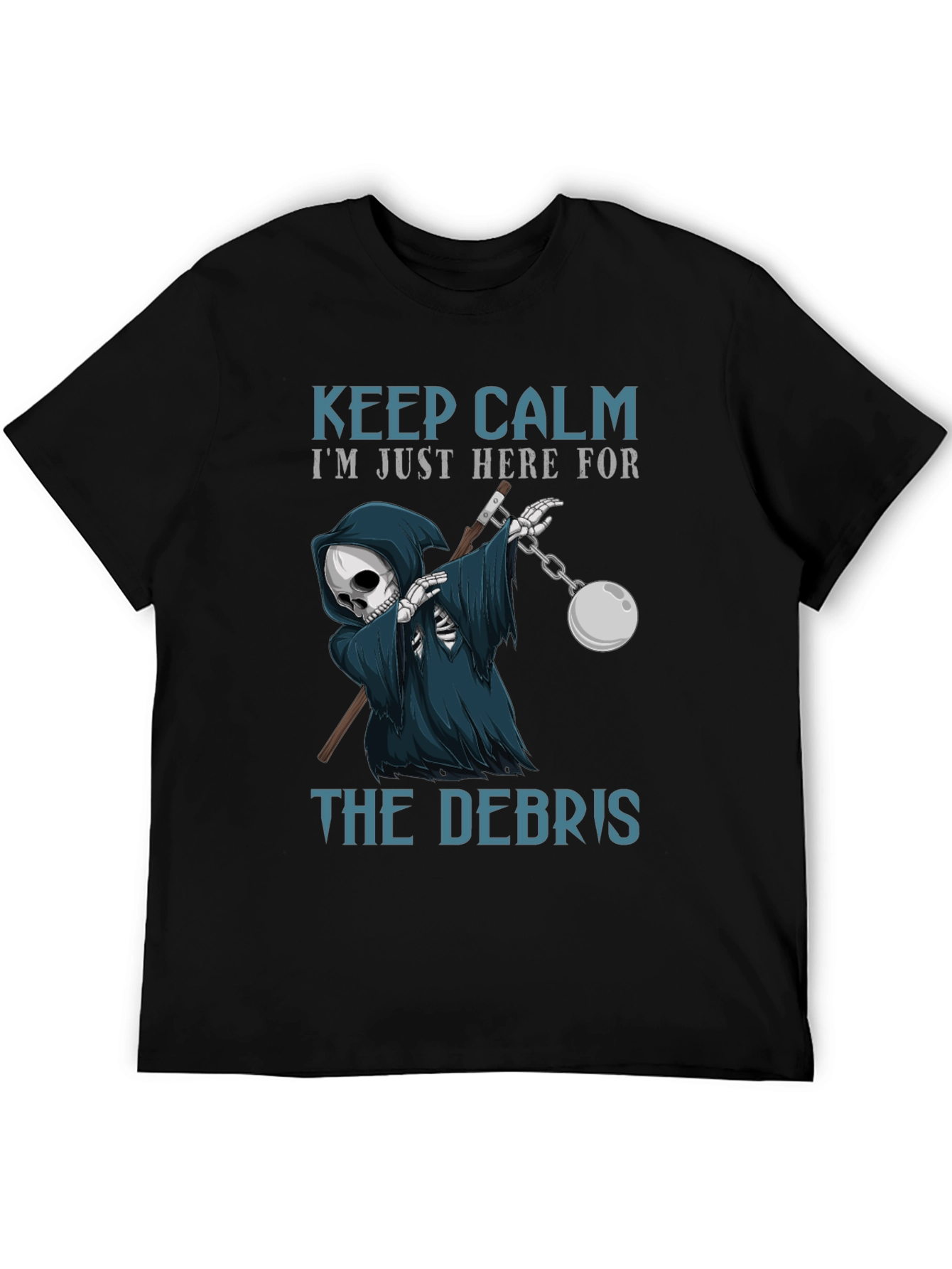 Show off your unique sense of humor with this eye-catching black t-shirt. Featuring a playful graphic of the Grim Reaper doing a 'dab' while holding a ball and chain, alongside the witty phrase "Keep Calm, I'm Just Here For The Debris", this shirt is sure to spark conversations. The design has a relaxed, comfortable fit, making it ideal for casual wear, Halloween parties, or anyone who loves a touch of edgy humor in their wardrobe. Made with a soft and breathable fabric, this tee will keep you comfortable all day long. Make a statement with this clever and fun t-shirt!