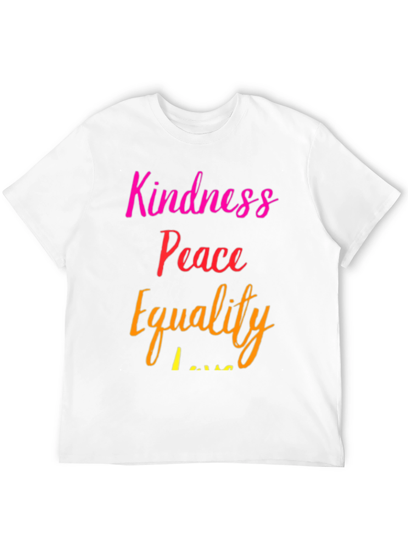 Show your support for important values with this stylish black t-shirt. Featuring the words 'Kindness,' 'Peace,' and 'Equality' in vibrant gradient colors, this shirt is sure to make a statement. Made from a soft, comfortable cotton blend, it's perfect for everyday wear. The relaxed fit ensures all-day comfort, whether you're out running errands or attending a peaceful protest. This tee is a great way to express your beliefs and spread positivity. Get yours today and let your values shine!