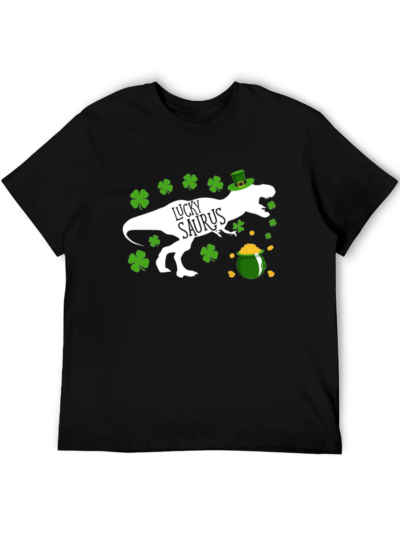 Celebrate St. Patrick's Day with this fun and festive black graphic tee! The shirt features a white dinosaur silhouette wearing a green leprechaun hat, surrounded by shamrocks and a pot of gold. The words "Lucky Saurus" are cleverly integrated into the dinosaur design. Made from a comfortable-looking fabric, this tee is perfect for casual wear during St. Patrick's Day festivities, parties, or any day you want to show off your Irish spirit and love for dinosaurs. It's a unique and eye-catching design that's sure to bring a smile to everyone's face. Get yours today and get ready to celebrate in style!