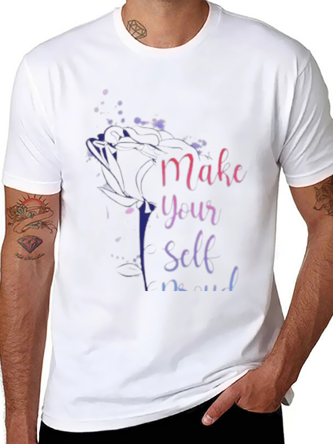 Elevate your wardrobe with this unique black t-shirt. The shirt features a vibrant and artistic graphic design blending a rose motif with inspiring text. "Make Yourself Heard" is written in a stylish, eye-catching font using a blend of purple and pink hues. Made from what appears to be a soft and breathable fabric, this tee offers both comfort and style. Ideal for casual wear, parties, or expressing your individuality. Pair it with jeans, shorts, or a skirt for a versatile look. Make a statement and let your voice be heard with this standout t-shirt!